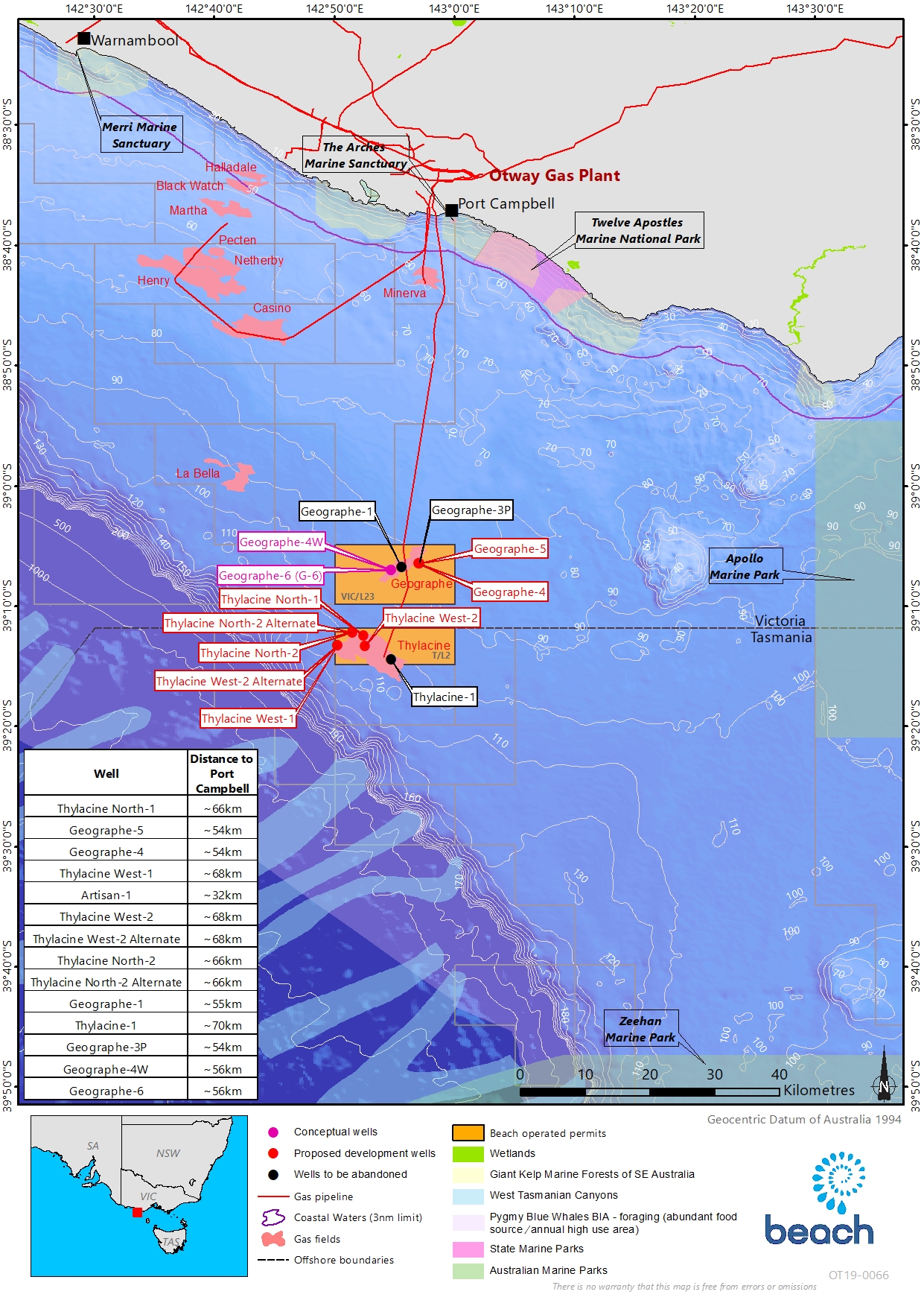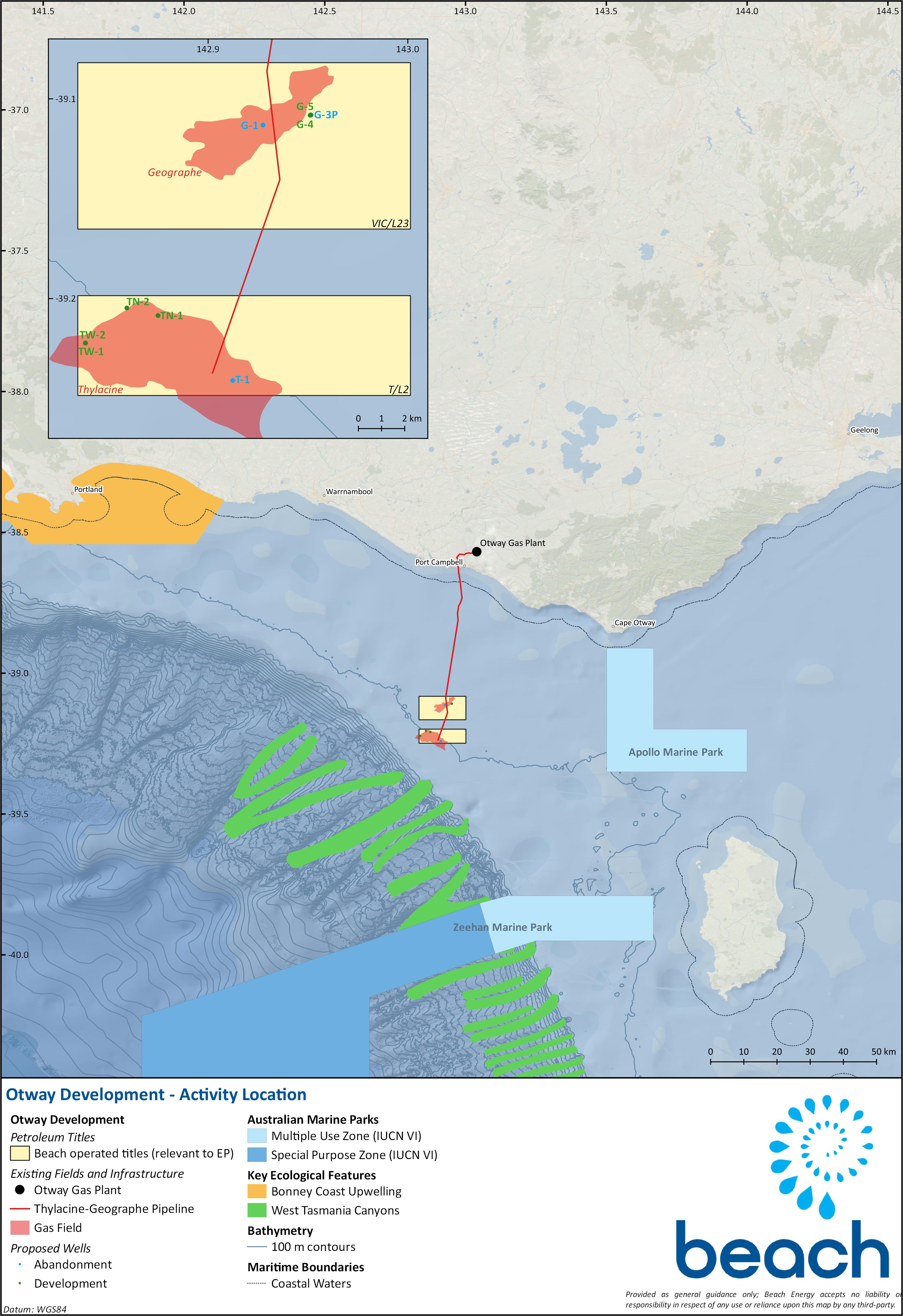 Beach Energy (Operations) Limited (Beach), proposes to drill up to six development wells and abandon three existing subsea wells in Commonwealth waters of the Otway Basin. The development well closest to shore is approximately 54 km from Port Campbell off Victoria’s south-west coast. The proposed development wells and existing subsea wells for abandonment are in water depths ranging from approximately 84 m to 105 m.