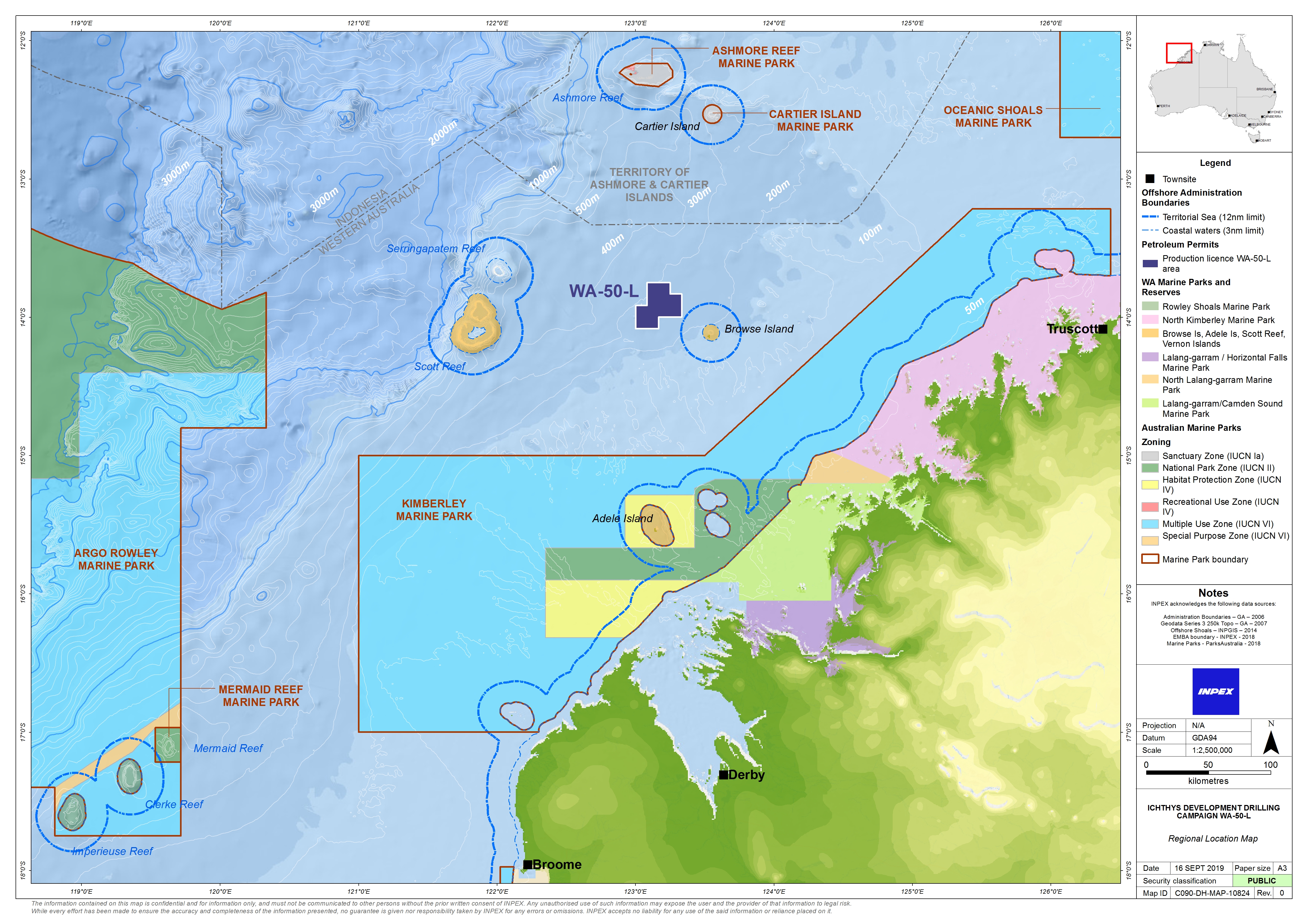 The Ichthys Field, within production licence WA-50-L, is located in the Browse Basin in Commonwealth waters within Western Australia. It is approximately 230 km north west of the Kimberley coastline, at its closest point. Water depths at the proposed well locations range between 235 m and 275 m at lowest astronomical tide. The closest major town is Derby, located approximately 390 km south of the southern boundary of the licence area.