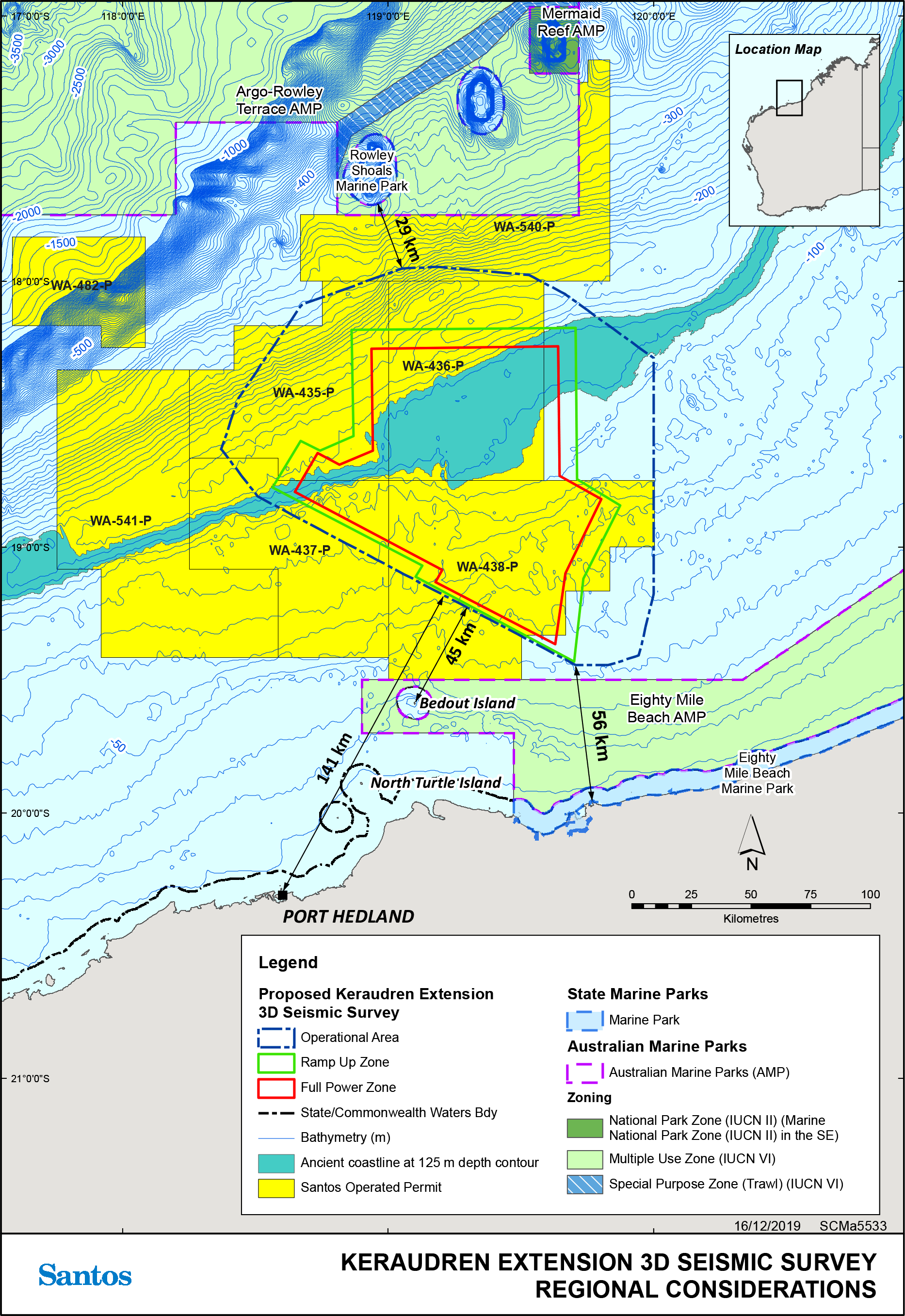 Santos WA Northwest Pty Ltd (Santos), who are wholly owned by Santos Energy Limited, propose to undertake a 3D seismic marine survey (the ‘survey’) over a portion of exploration permit areas WA-435-P, WA-436-P, WA-437-P and WA-438-P, and surrounding waters in the Bedout Sub-basin in Commonwealth waters off the coast of Western Australia. At its closest point, the survey Operational Area is located approximately 45 kilometres (km) from the nearest land (Bedout Island), 56 km from the nearest mainland coastline and 141 km from the nearest regional town Port Hedland.