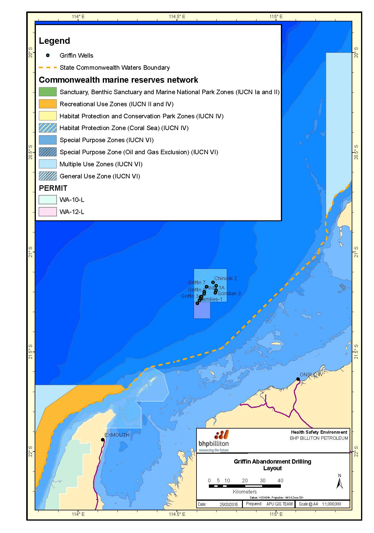 The Griffin Well Abandonment Activities for 13 wells (8 Griffin wells;3 Scindian wells, Chinook-1 well and Ramillies-1 well) is located in Permit Areas WA-10-L and WA-12-L in Commonwealth waters, approximately 68 km northwest of Onslow, Western Australia (WA). The Griffin Well Abandonment Activity will commence in 2015/2016 and will occur over an estimated 6-month period. The Activity will require a semi-submersible mobile offshore drilling unit (MODU). The Activity will take place 24 hours a day and is expected to take an average of 12 days to permanently abandon each well (inclusive of MODU mooring activities by AHTS vessels).