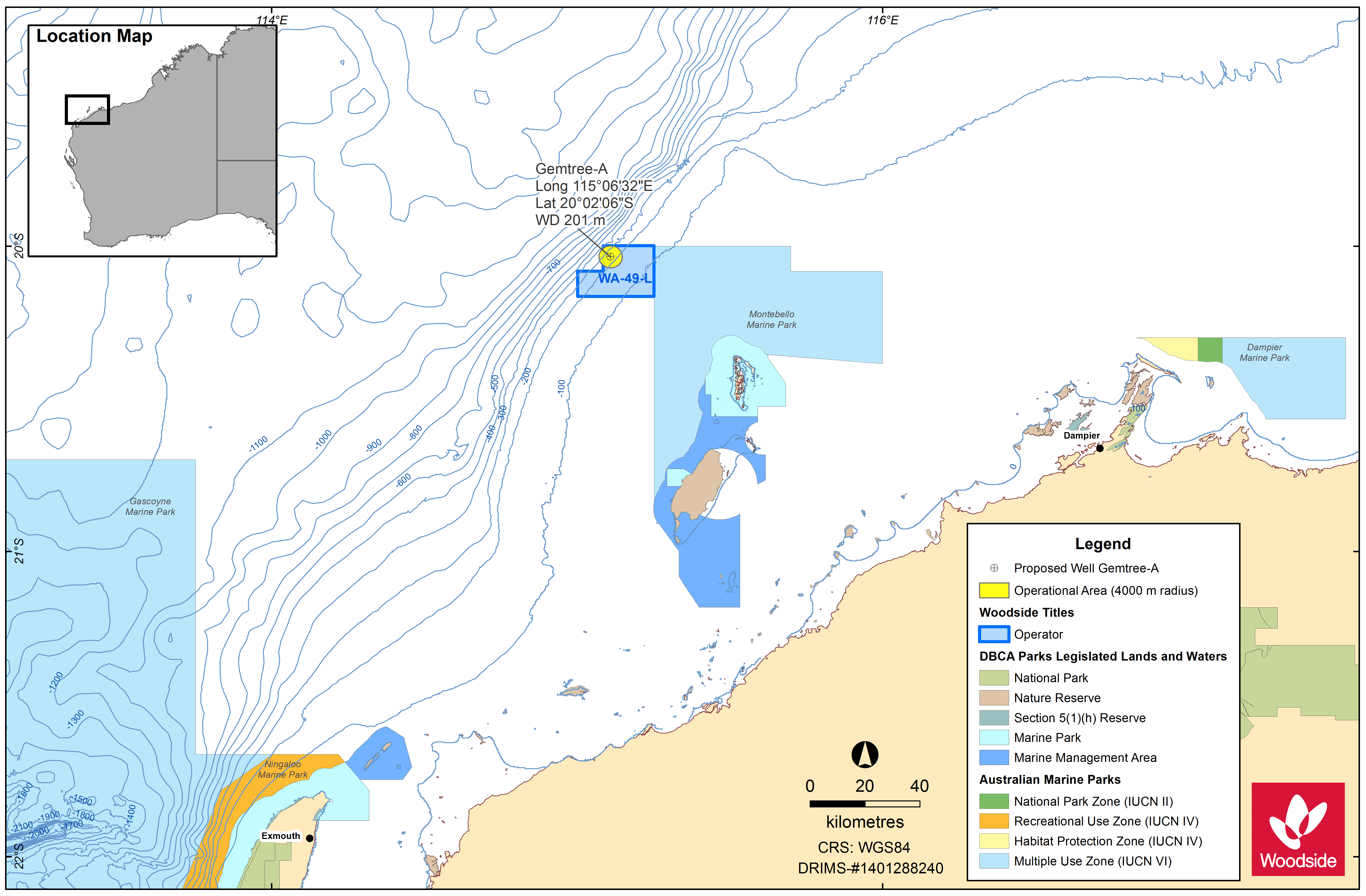 Woodside Energy Julimar Pty Ltd (Woodside), proposes to drill a single exploration well (named Gemtree-A) within Permit Area WA-49-L. The proposed Gemtree-A Well is located in Commonwealth waters in the Barrow subbasin, about 142 km off the Pilbara coast of Western Australia. The closest landfall to the well location is the Montebello Islands, which are about 55 km southeast (and 47 km to the Montebello Island Marine Park).