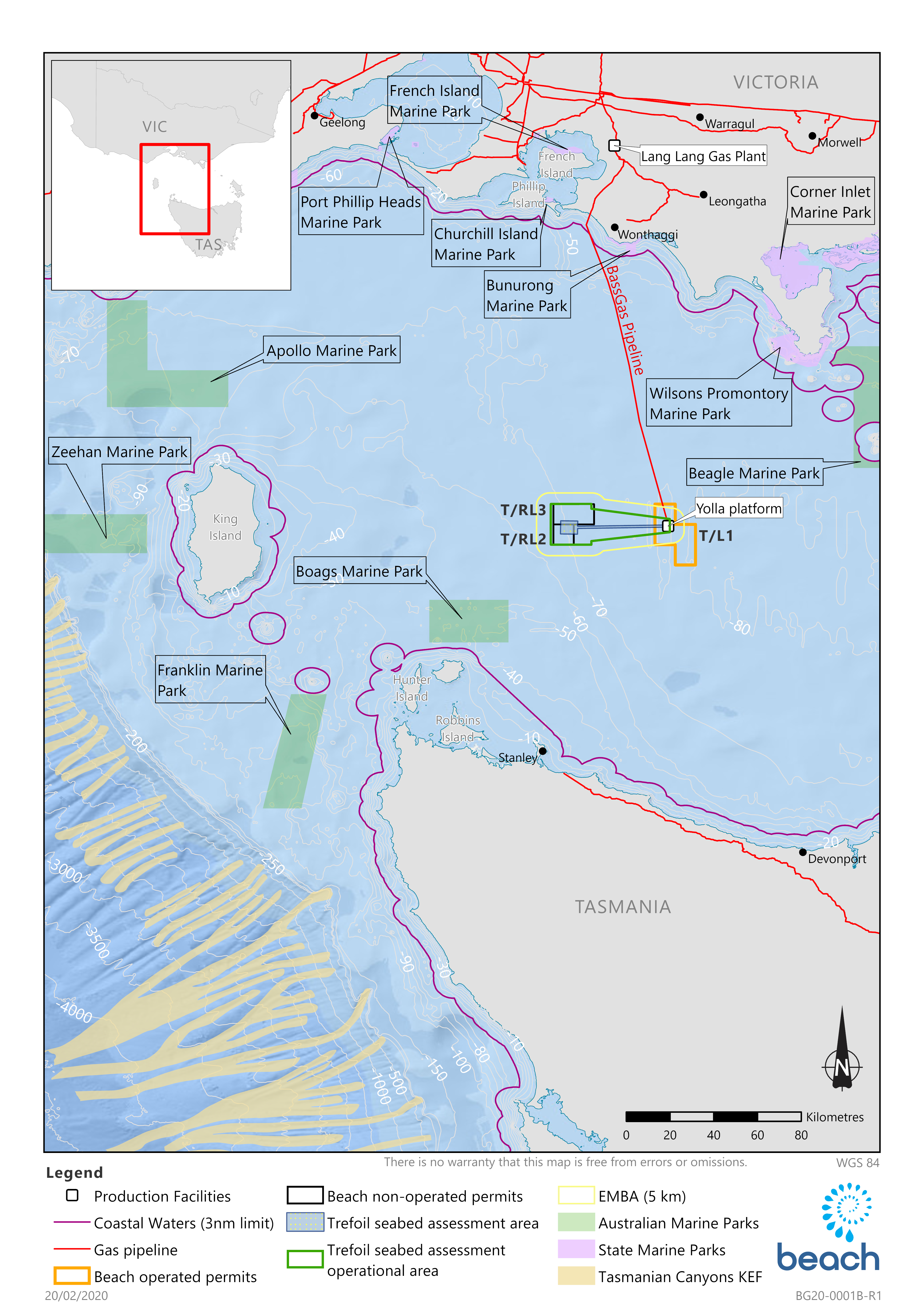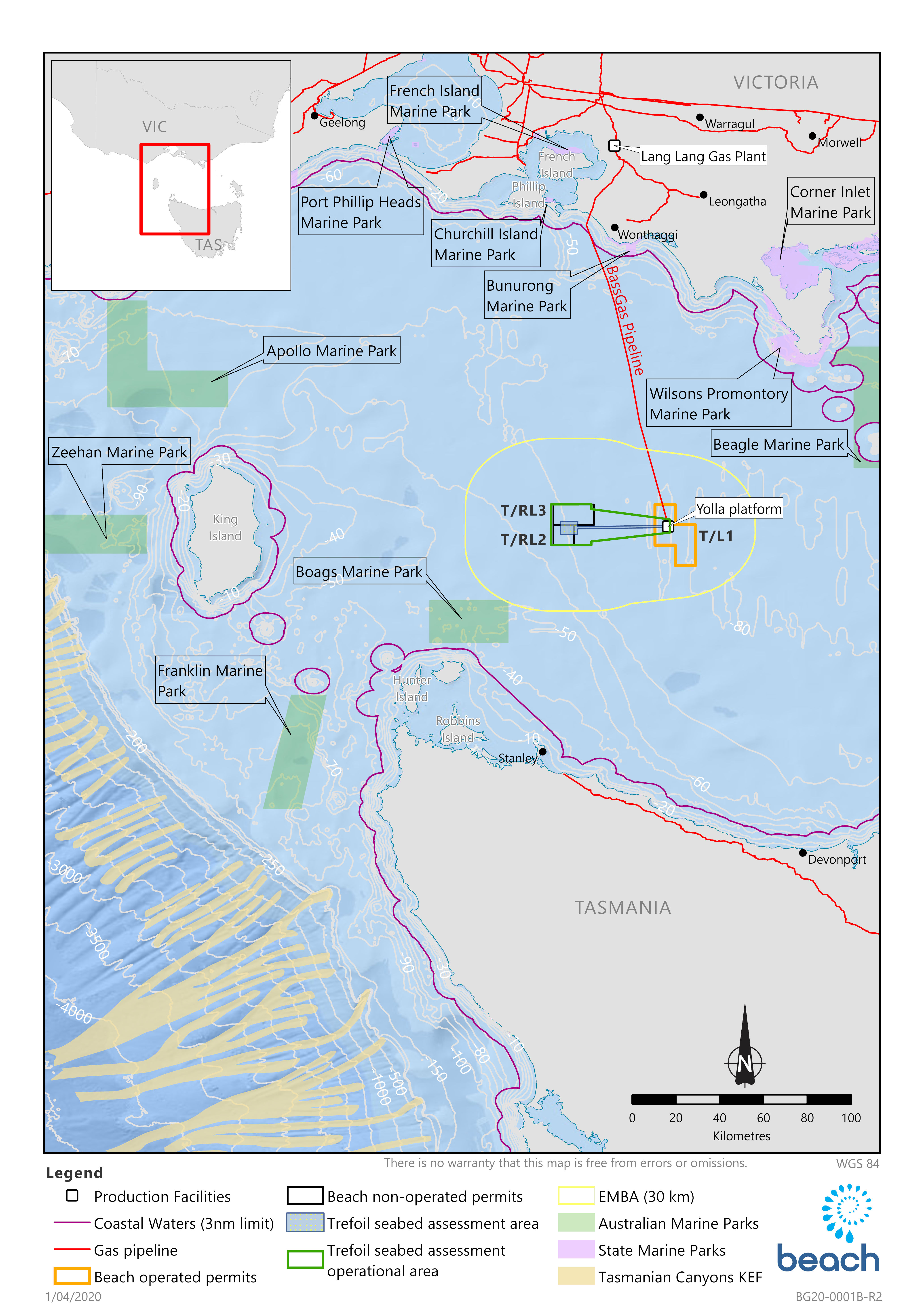 Beach Energy (Operations) Limited (Beach), propose to undertake a geophysical and geotechnical seabed assessment (seabed assessment) within the Rockhopper (T/RL3), Trefoil (T/RL2) and Yolla (T/L1) permits and open acreage within the Bass Strait in Commonwealth waters. The seabed assessment operational area is approximately 126 km from Wonthaggi, Victoria and 94 km from Stanley, Tasmania.