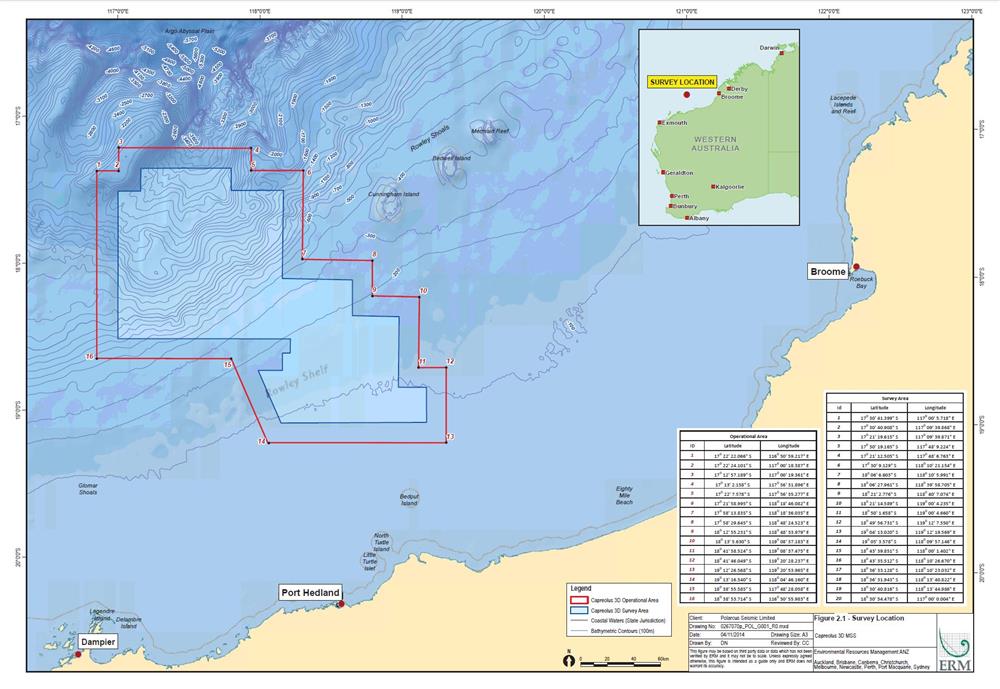 Polarcus Seismic Limited (Polarcus) proposes to undertake a three-dimensional marine seismic survey (Capreolus 3D MSS) in Commonwealth waters of the Offshore Roebuck Basin, Western Australia, commencing in January 2015 for a period of up to six months. The survey will be undertaken in an area of the North West Shelf located approximately 120 km north of Port Hedland and approximately 320 km west of Broome.