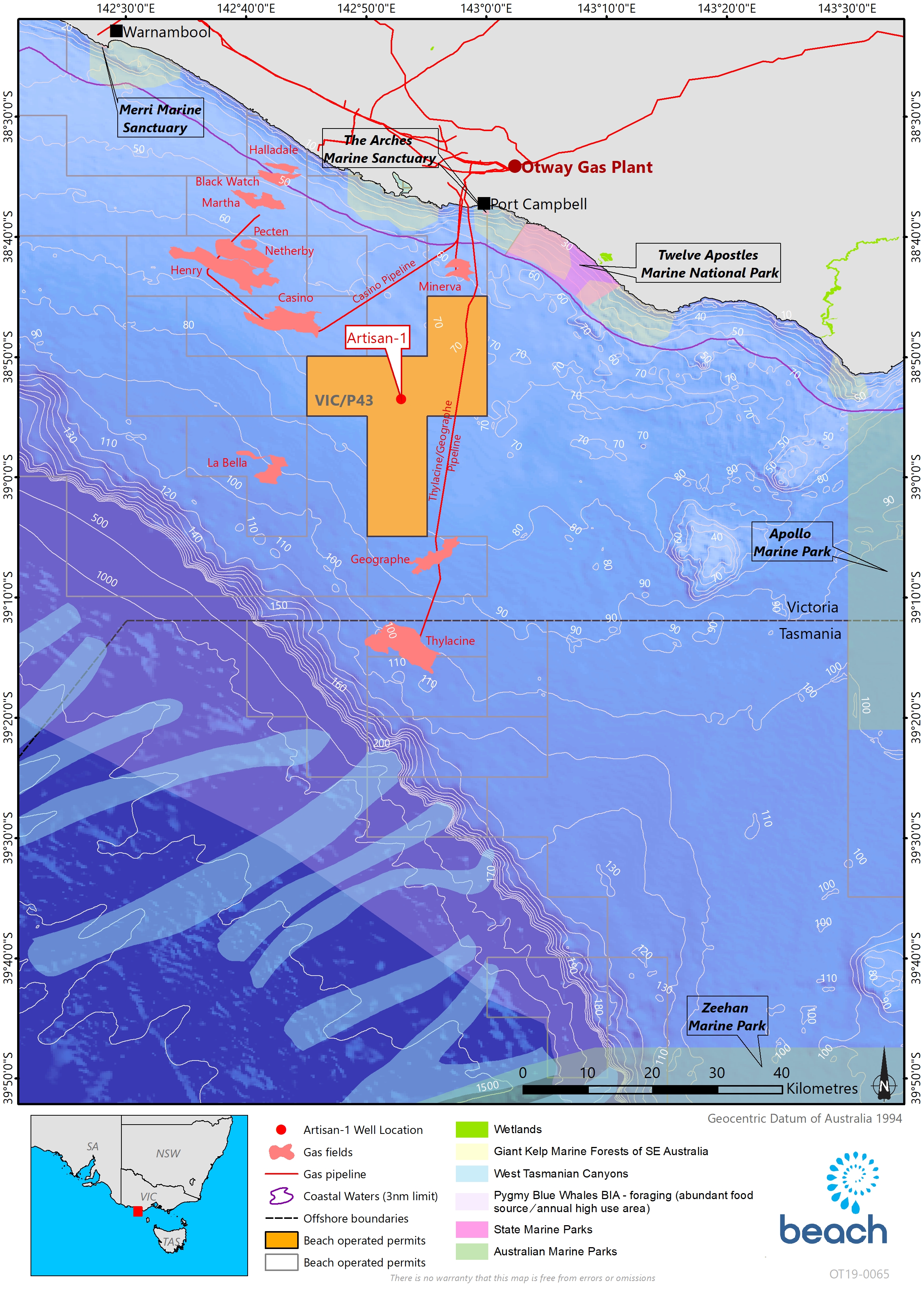 Beach Energy (Operations) Limited (Beach) proposes to drill a single exploration well (with the option to suspend and develop pending reservoir analysis) in Commonwealth waters of the Otway Basin approximately 32 km off Victoria’s south‐west coast. The proposed Artisan‐1 well location is at a water depth of approximately 71 m.