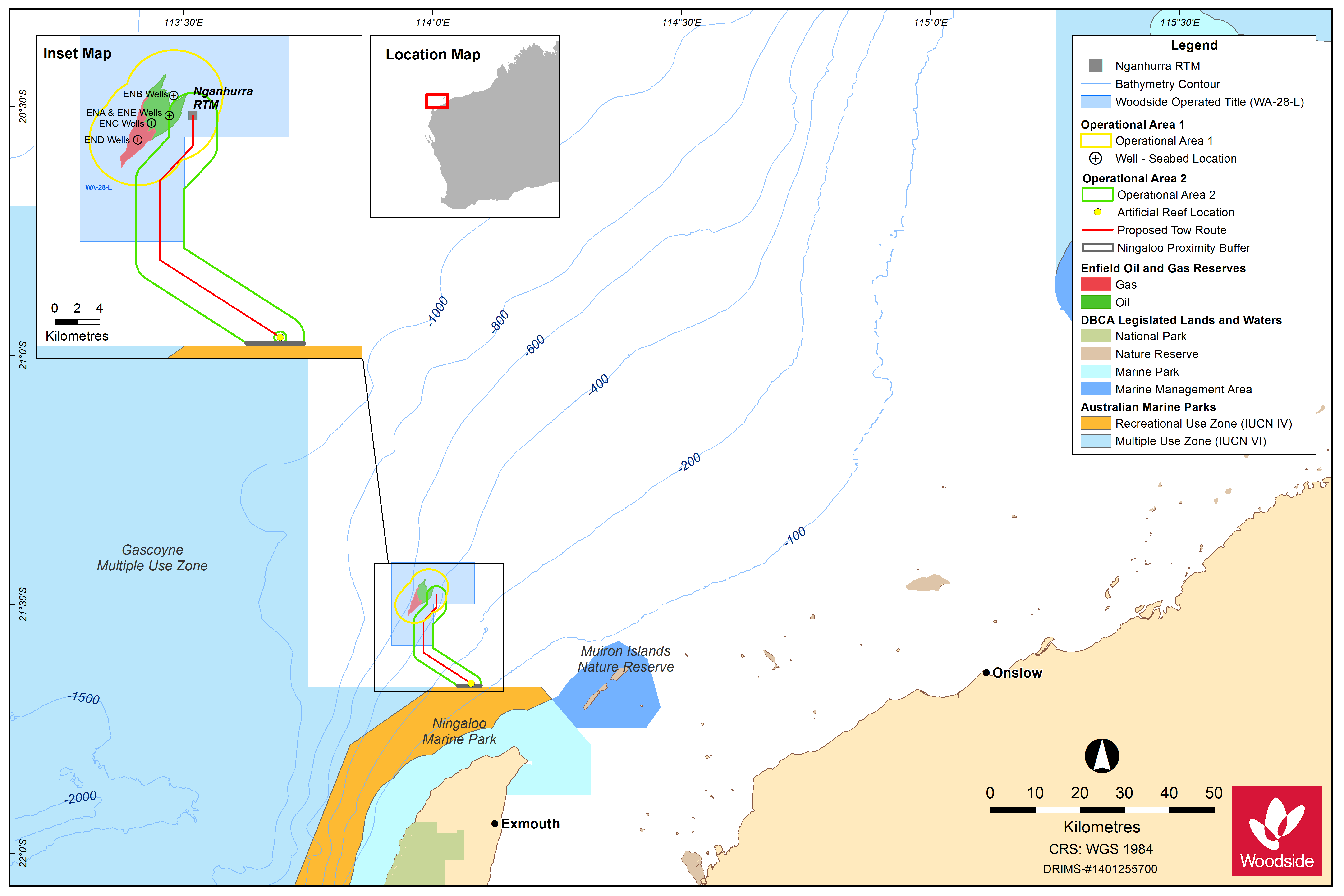 For the purpose of this Environment Plan, two Operational Areas have been defined to allow impacts and risks to be evaluated separately for activities conducted within WA-28-L and activities associated with towing, installation on the seabed, stabilisation and modification of the RTM on the seabed, and placement of reef modules to form an IAR. The operational areas have been defined as follows:
