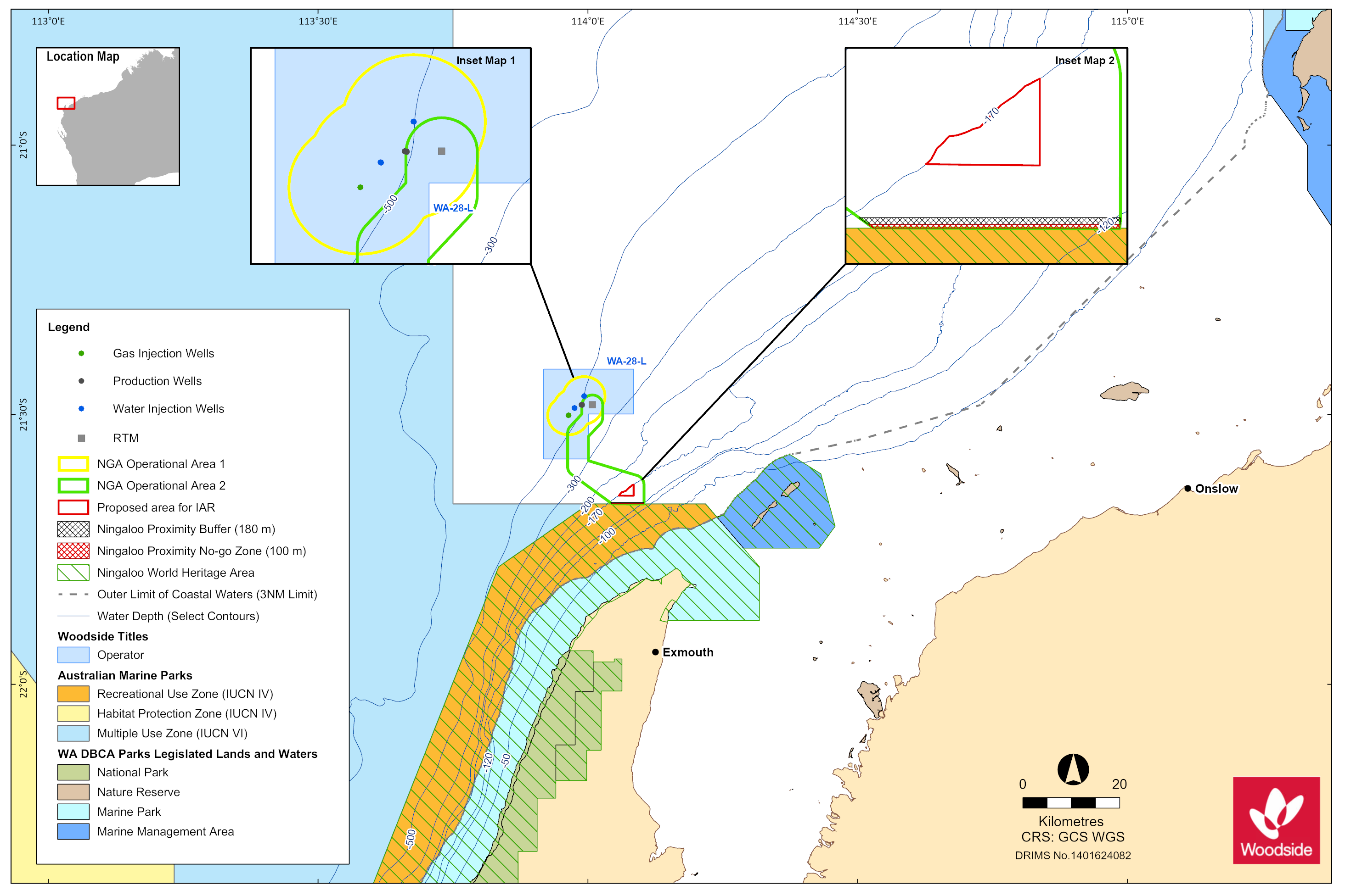 • 1700 m distance between the proposed area for the IAR and the Ningaloo WHP and AMP. The IAR will not be installed within this area, however it has been included in Operational Area 2 for vessel activities