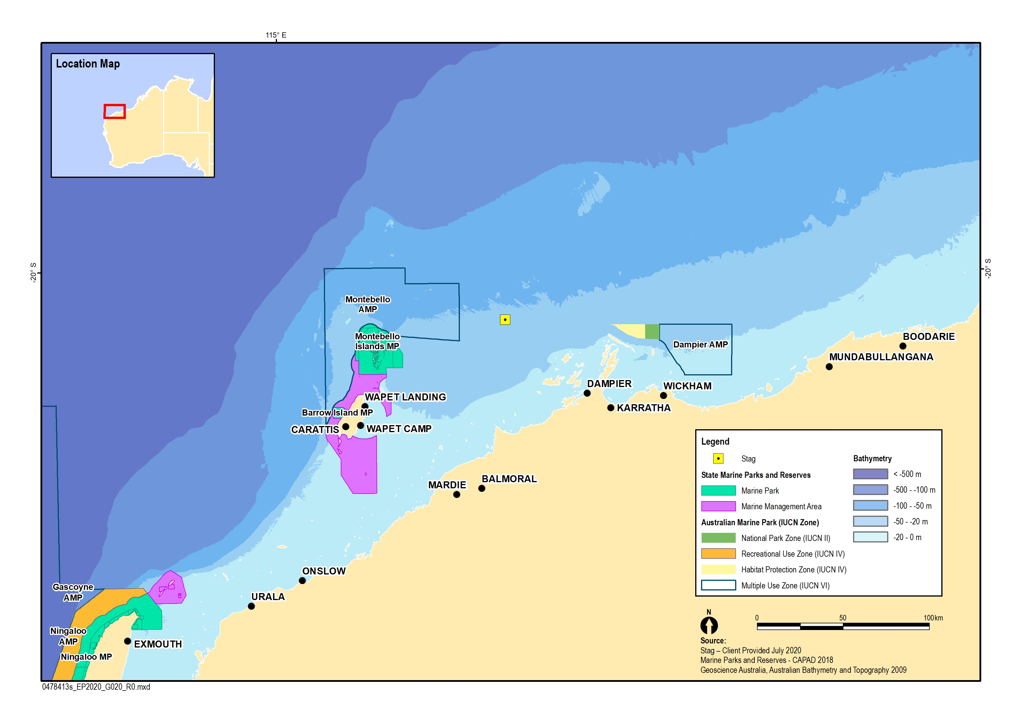 The Stag Facility is located in permit area WA-15-L and WA-6-PL approximately 60 kilometres (km) northwest of Dampier. Activities associated with the Facility include: