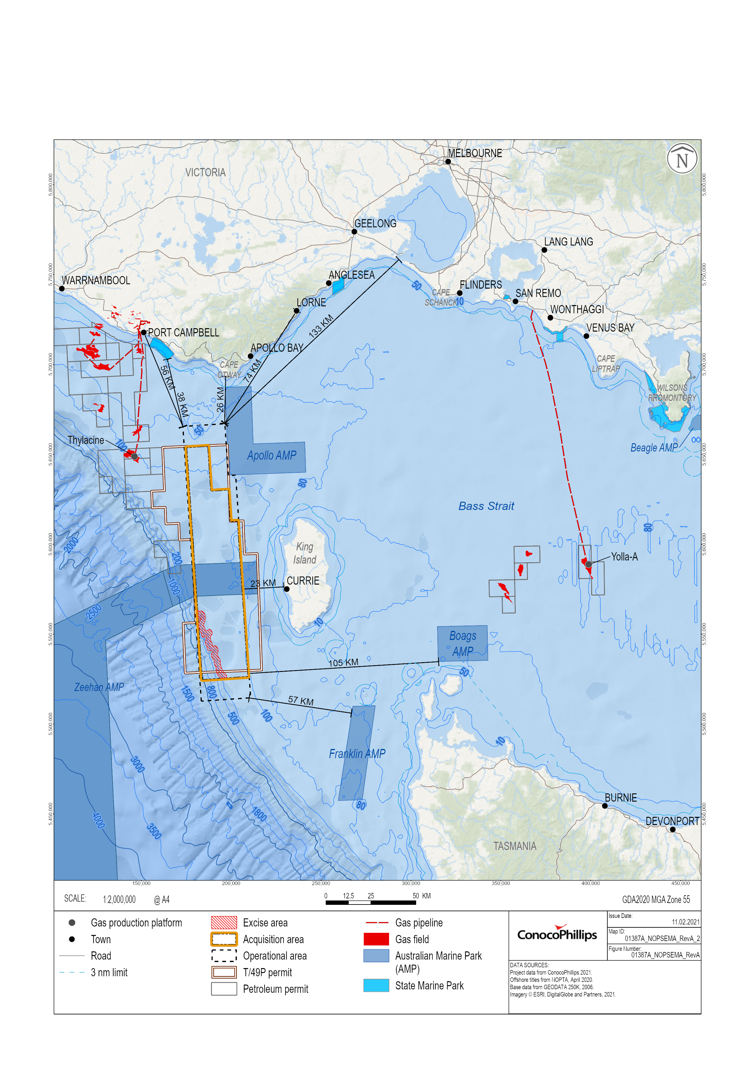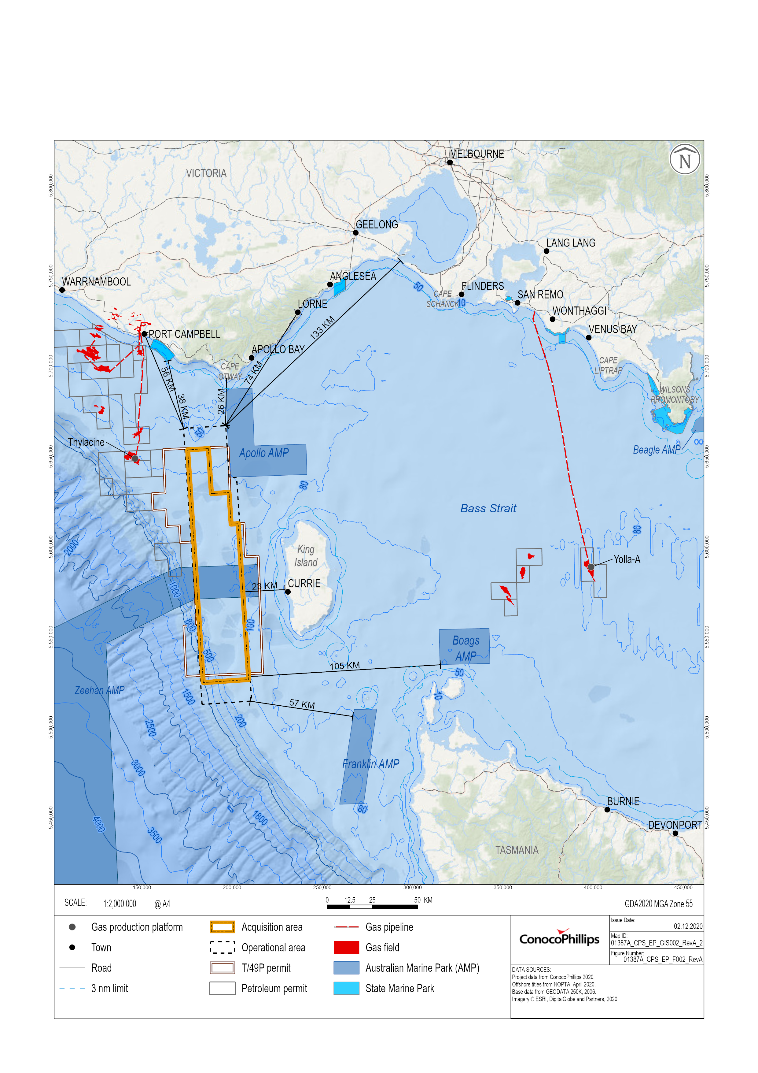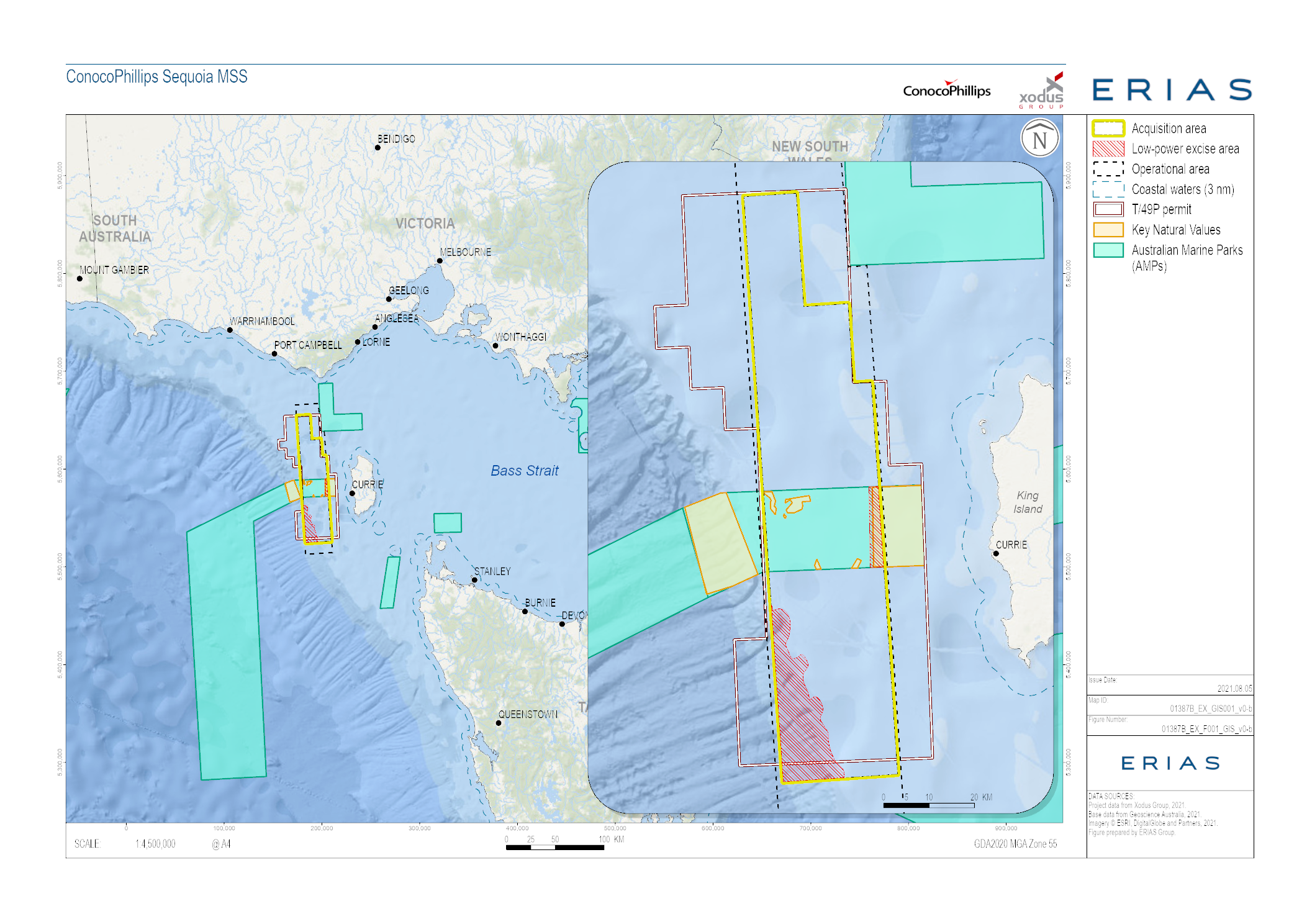 ConocoPhillips Australia SH1 Pty Ltd is planning to undertake the Sequoia 3D Marine Seismic Survey (the ‘survey’) in Exploration Permit T/49P, in Commonwealth waters. At its nearest points, the survey area is located 23.5 km from the west coast of King Island and 26 km from the Victorian coast. Water depths in in this area range from 70 m to 1,000 m, with approximately 90% of the survey area being in water depths of less than 150 m.