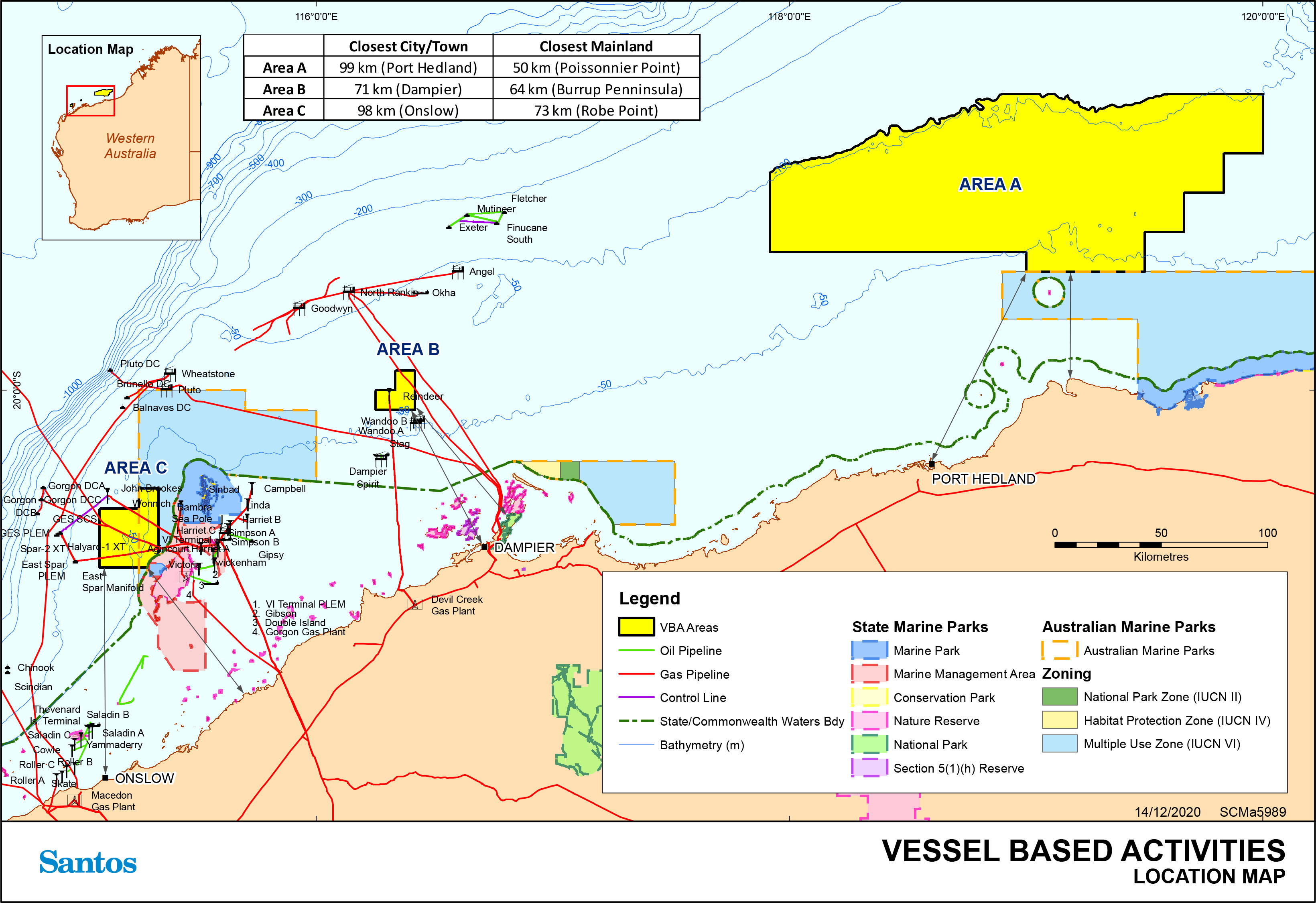 Area A is approximately 9km from Bedout Island and 50km to the Eighty Mile Beach Marine Park, whilst area B is approximately 45km from the Dampier Archipelago and 71km to Dampier on the mainland. Area C overlaps with the Montebello Australian Marine Park and is nearby to the Barrow Island Marine Management Area and Marine Park.
