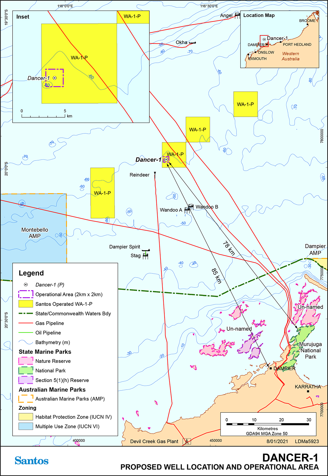 Santos WA Northwest Pty Ltd (Santos) proposes to undertake a single-well exploration drilling campaign in permit area WA-1-P, targeting a gas reservoir in the Legendre formation (Figure 2 1). The permit area is within offshore Commonwealth waters in water depths of approximately 63 metres (m).