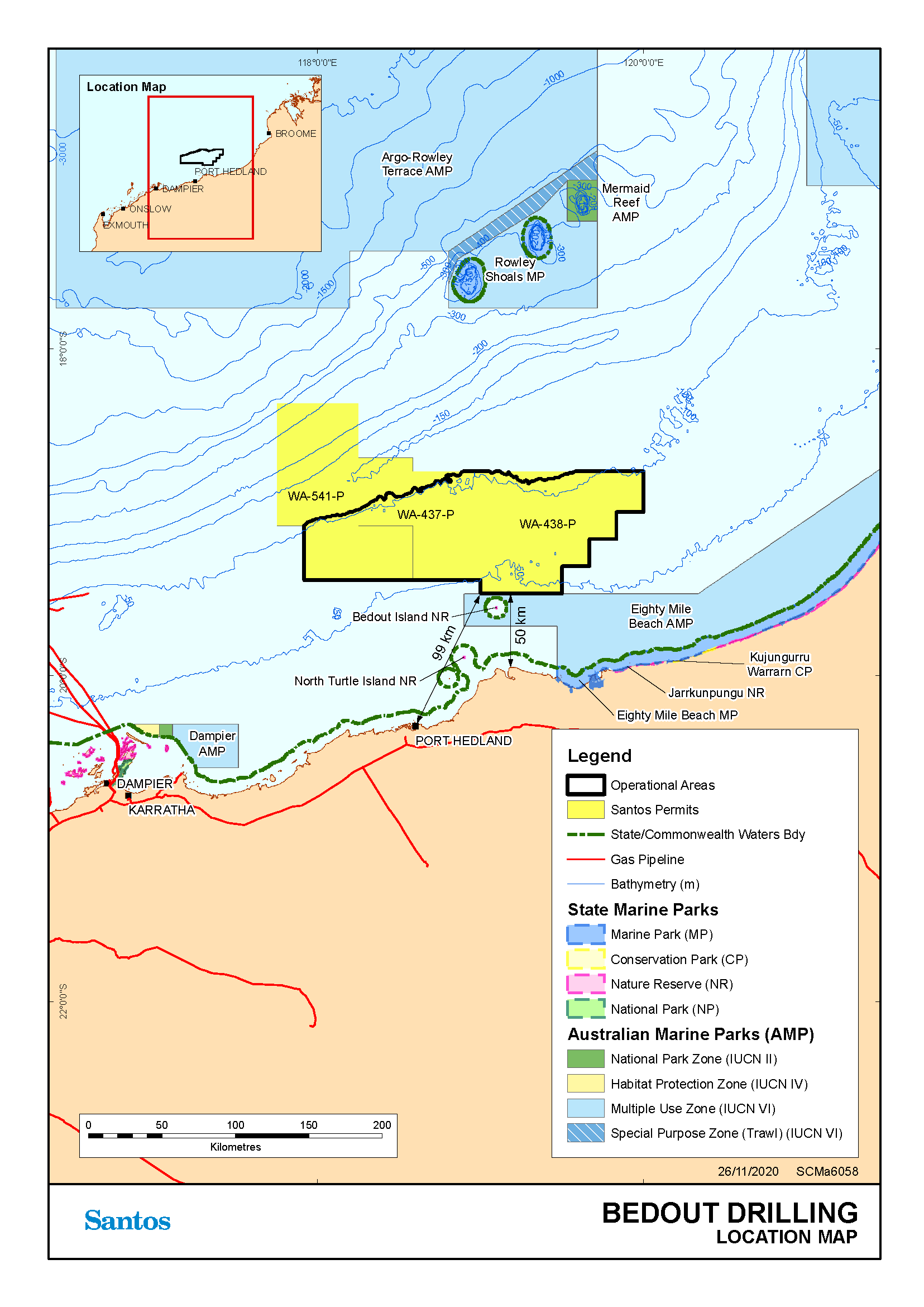 Santos WA Northwest Pty Ltd (Santos) proposes to drill up to 8 wells (2 exploration and up to 6 appraisal) across two operational areas located in permit areas WA-437-P and WA-438-P, within the Bedout Basin on the North West Shelf (NWS).