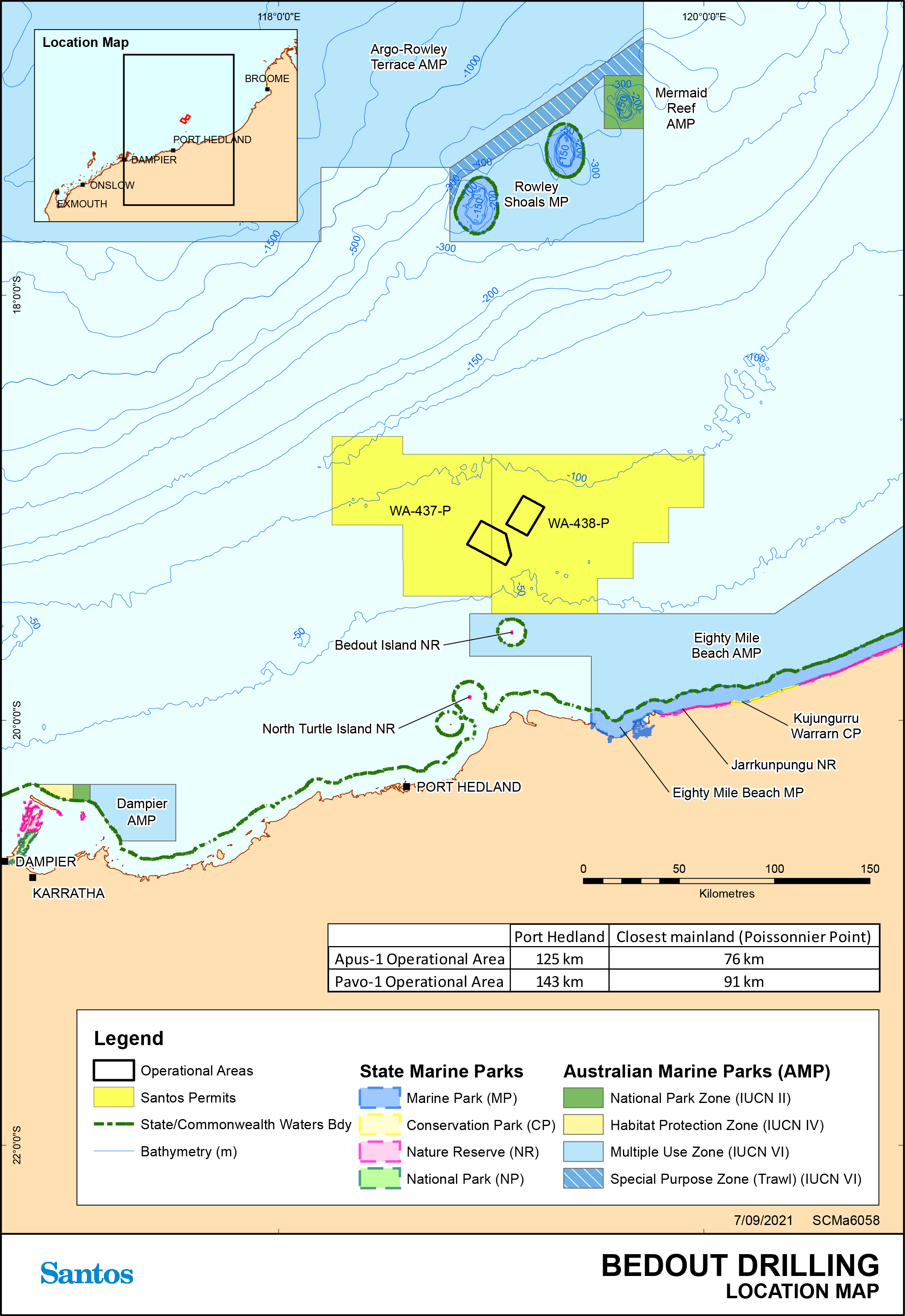The two operational areas are wholly within offshore Commonwealth waters in water depths of approximately 65 to 93m. The closest operational area is approximately 35 km north from the nearest shoreline (Bedout Island), 76 km from the closest mainland point (De Grey River-mouth) and 125 km from Port Hedland.