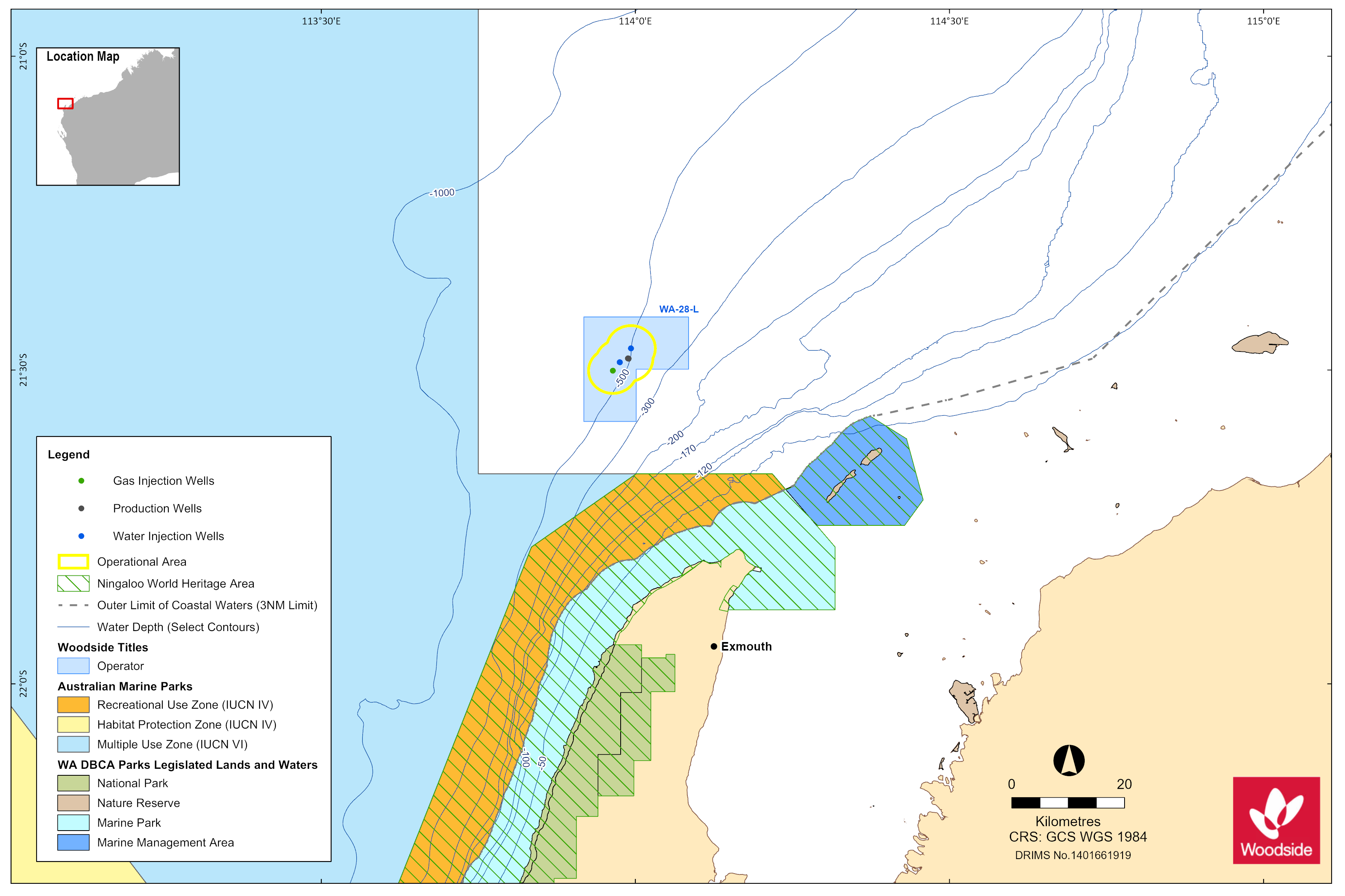 The Petroleum Activities Program is located in Commonwealth waters in the Exmouth Sub-basin. It is located approximately 38 km north of the North West Cape of Western Australia about 2 km to the east of the Enfield reservoir. The water depth across WA-28-L varies from 200 m in the east to over 2000 m to the west. Water depth is approximately 400 - 600 m. The Petroleum Activities Program does not overlap with any established or proposed marine protected areas. The closest nearshore sensitive habitats to the Petroleum Activities Program is the Commonwealth boundary of the Ningaloo Reef Australian Marine Park approximately 16 km to the south, the Gascoyne Australian Marine Park approximately 18 km to the west, and the Muiron Islands Marine Management and Conservation Area approximately 31 km to the south-east.