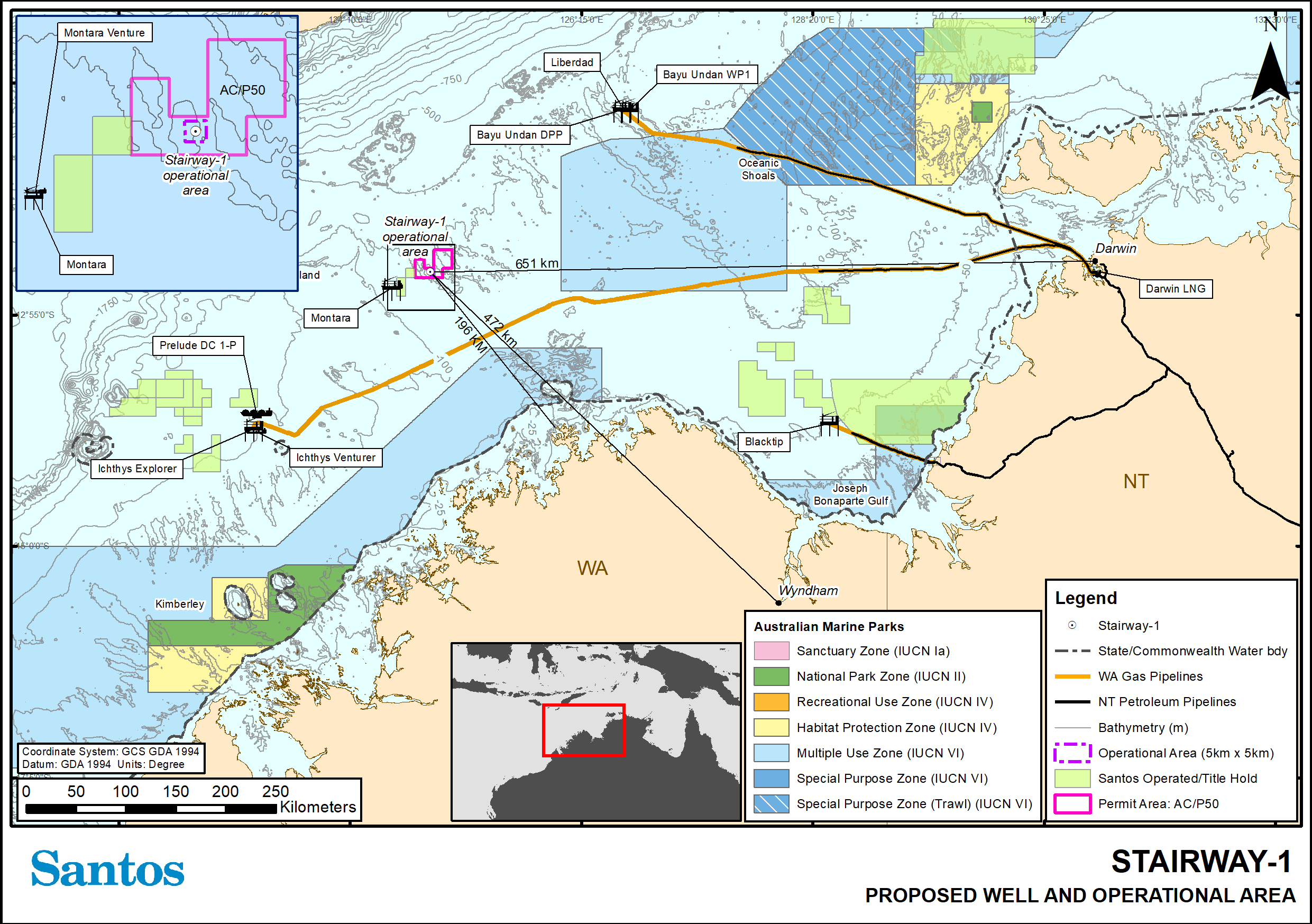 Santos proposes to conduct a vessel-based survey in permit area AC/P50 located in Commonwealth waters, within an operational area of 5 km by 5 km centred around the proposed well location. The operational area is approximately 650 km west of Darwin and approximately 200 km north west of the nearest shoreline.