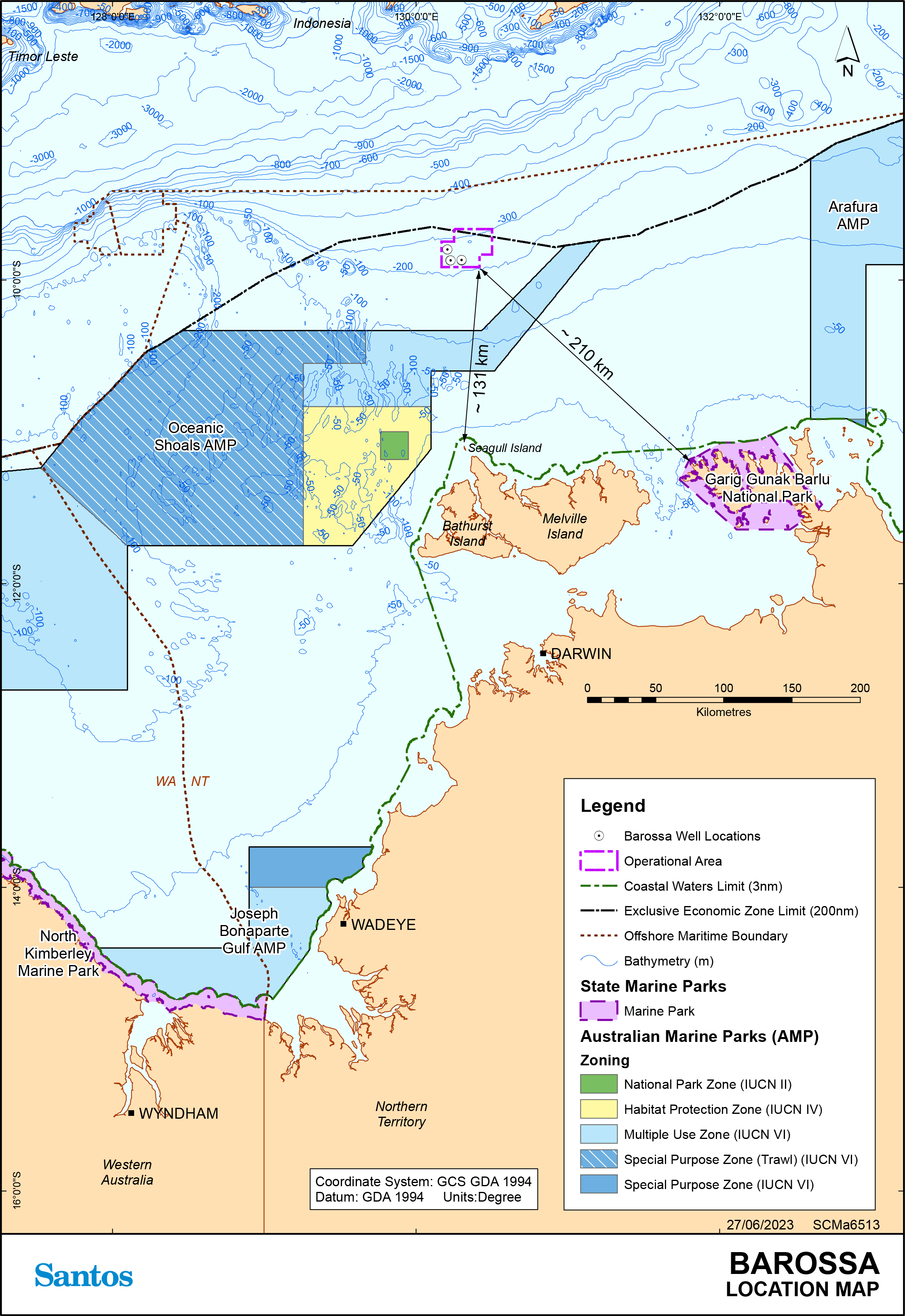 The Barossa Development is an approved offshore natural gas and condensate development proposed to backfill gas supply to the existing Darwin LNG (DLNG) facility at Wickham Point. Natural gas would be extracted from the Barossa field, located in Commonwealth waters approximately 285 kilometres offshore north-north west from Darwin, and transported via gas pipeline (Gas Export Pipeline (GEP) and Darwin Pipeline Duplication (DPD)) to the existing DLNG facility. Santos NA Barossa Pty Ltd (Santos), is the Operator of the Barossa Development, on behalf of co-venturers SK E&S Australia Pty Ltd, JERA Barossa Pty Ltd and Santos Offshore Pty Ltd, with first gas production targeted for the first half of 2025.