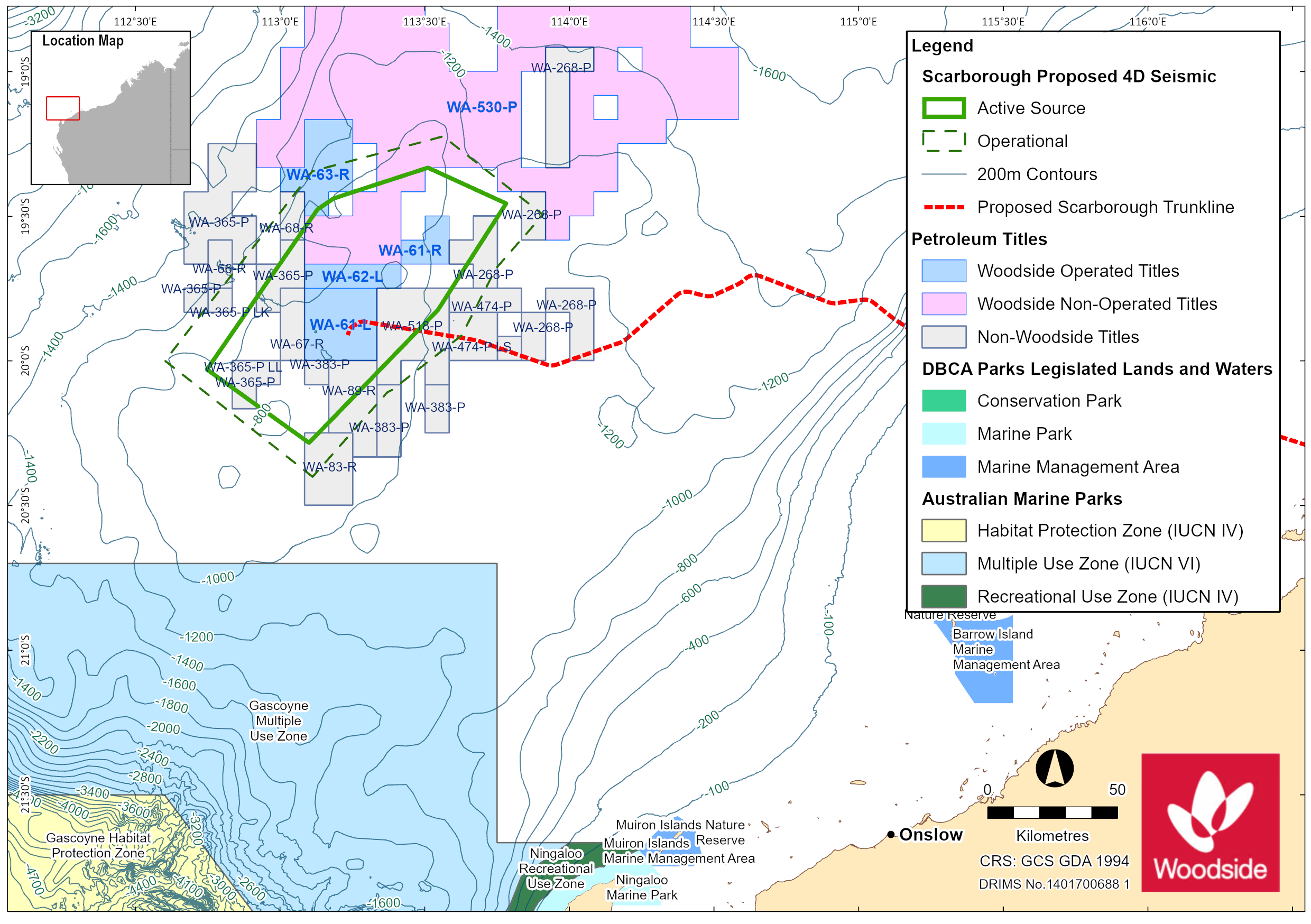 Woodside proposes to conduct a four-dimensional (4D) baseline (B1) marine seismic survey (MSS) over the Scarborough, North Scarborough and Jupiter gas fields within Commonwealth waters, located in the Carnarvon Basin. The proposed activity will occur within Woodside's Permit Areas WA-61-L, WA-62-L, WA-61-R, WA-63-R, as well as surrounding permit areas WA-530-P, WA-66-R, WA-67-R, WA-68-R, WA-83-R, WA-89-R, WA-268-P, WA-365-P, WA-365-P LL, WA-365-P LK, WA-383-P, WA-474-P, WA-474-P LS, WA-518-P, gazettal block W19-35 and WA-61-R in the Jupiter field. The survey is part of an appraisal program for reservoir management and will provide an uplift in seismic imaging for the Scarborough field from the 2004 vintage seismic data (HEX-003).