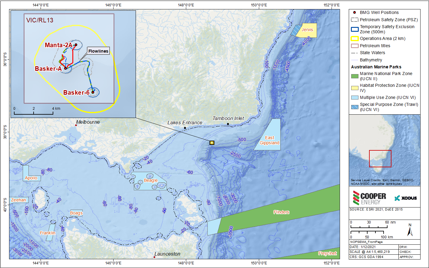 The Basker Manta Gummy (BMG) subsea oil development is located entirely within Retention Lease VIC/RL13 in Commonwealth waters. The development lies in water depths circa 135 m – 270 m, approximately 50 km from the Victorian coastline, south of Cape Conran.