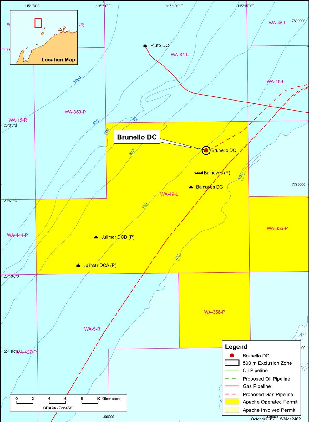 Apache proposes to undertake a seabed cuttings remediation activity at the Brunello drill centre in petroleum permit WA-49-L. The Brunello drill centre is located approximately 35 km northwest of the Montebello Islands and 77 km northwest from Varanus Island in approximately 148 m of water depth.
