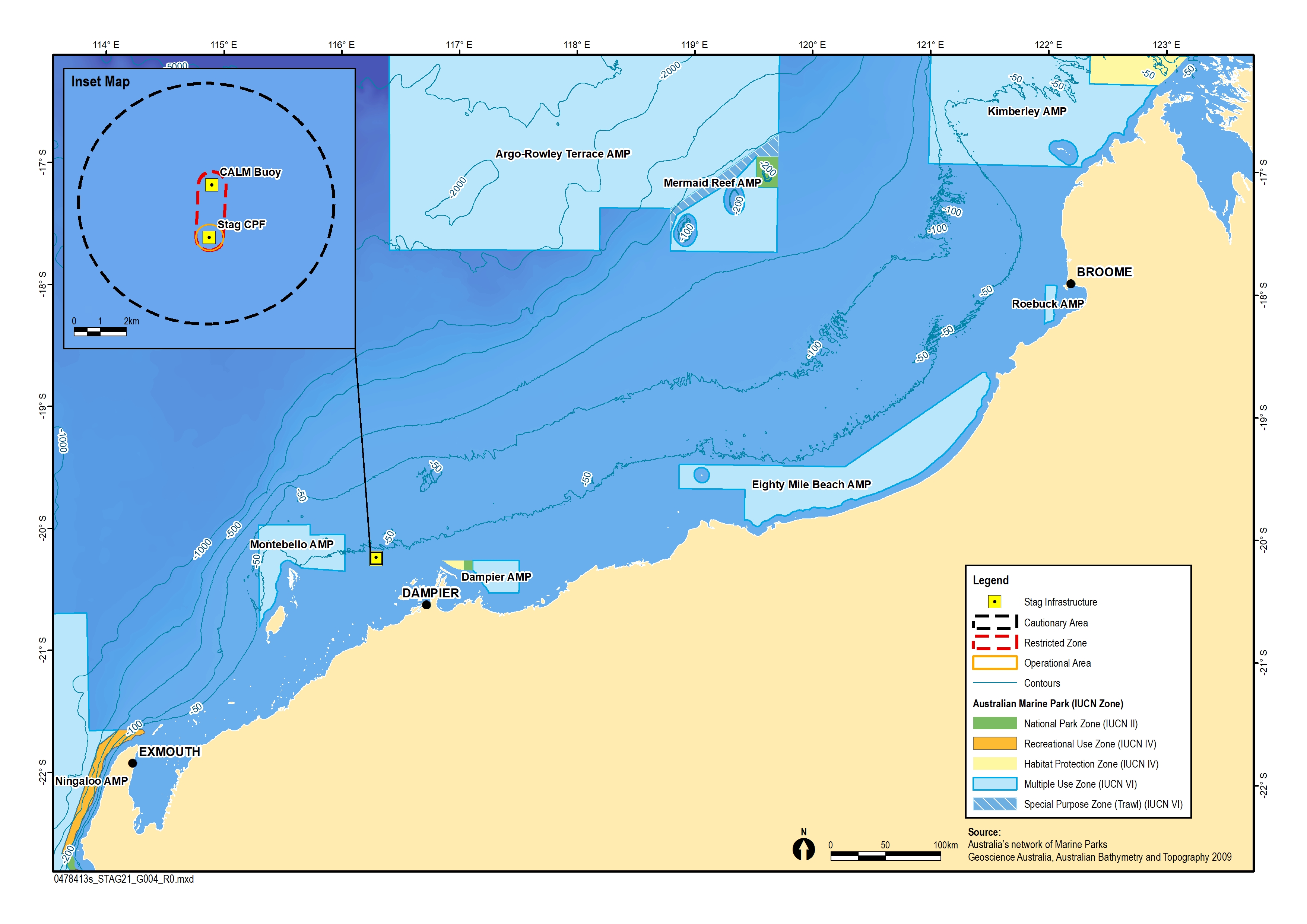 The location of the proposed production wells and P&A activity are at the Stag Central Production Facility (CPF) platform, within permit WA-15-L. The CPF is located on the North-west shelf (NWS) off Western Australia (WA), approximately 60 km north-west of Dampier. The Operational Area is defined as the area within a 500m radius that extends around the tophole location of the well activity, which is at the Stag CPF.
