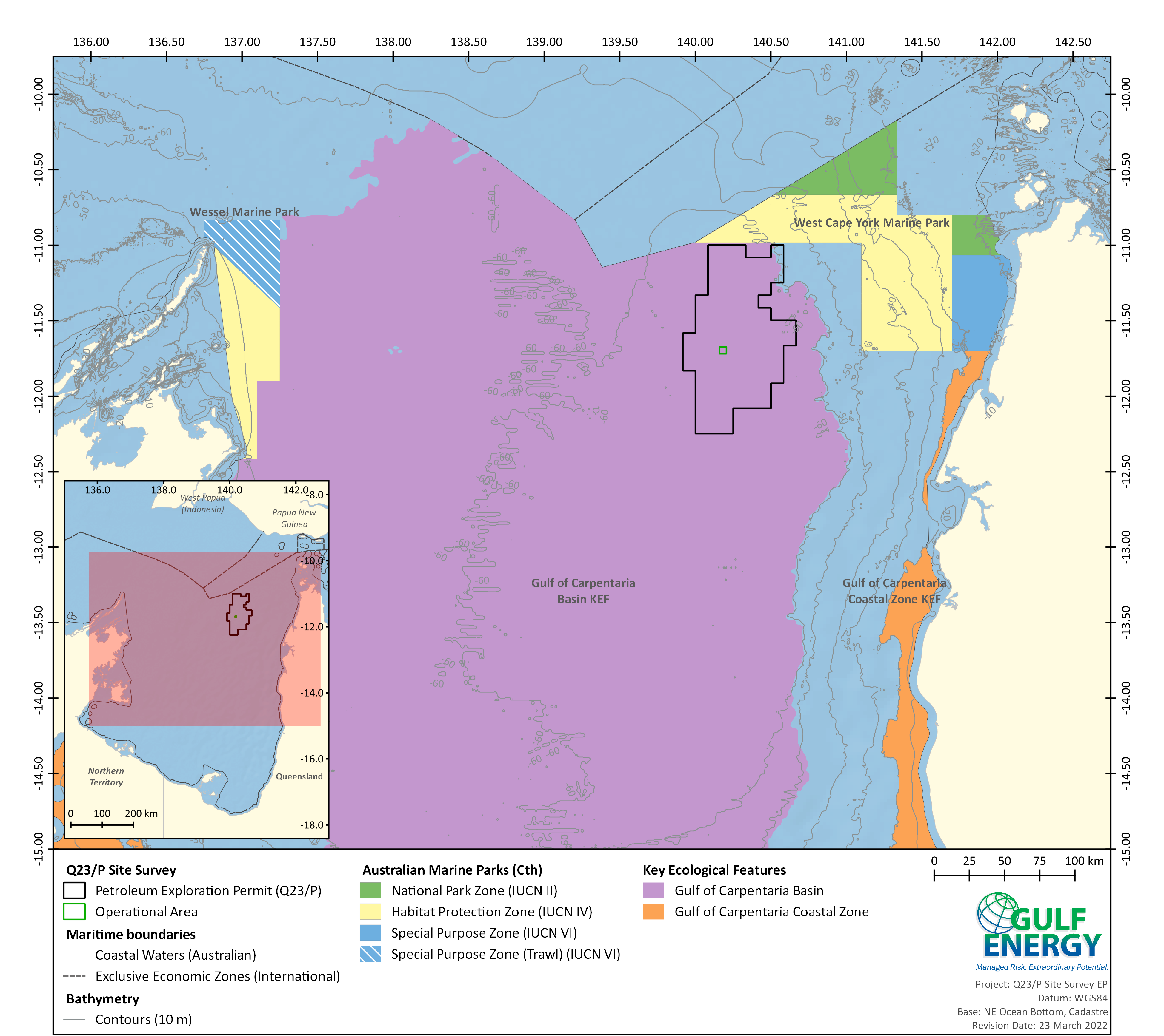 Gulf Energy Pty Limited propose to undertake a Geophysical and Geotechnical Site Survey within the Q/23P petroleum exploration permit in the Gulf of Carpentaria.