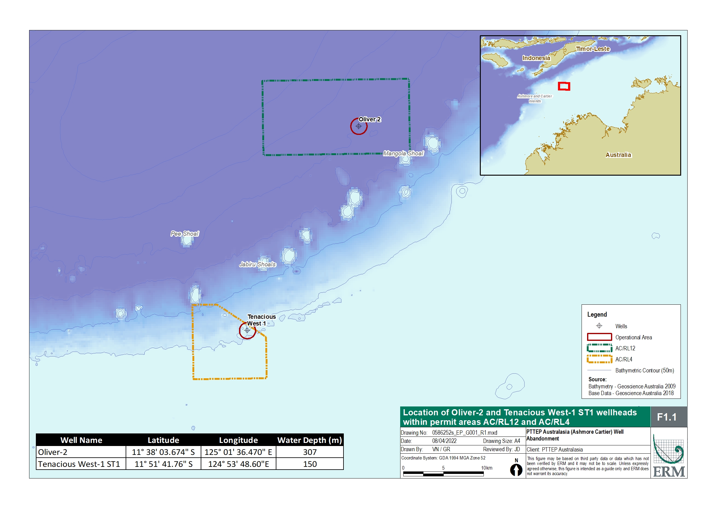 This EP revision covers the decommissioning of two permanently plugged wells, Oliver-2, located in permit area AC/RL12 and Tenacious West-1 ST1, located in permit area AC/RL4. These wellheads currently remain on the seabed and the wells are classified as having adequate barriers in place for permanent abandonment, as outlined in an accepted Well Operation Management Plan (WOMP; Revision 4, PTTEP Technical Document CORP-DR-D41-868269 (HQ202103848.1). Final abandonment reports have been accepted by the National Offshore Petroleum Safety and Environmental Management Authority (NOPSEMA) for both wells. The scope of the EP revision covers the permanent abandonment of the two wellheads in situ. The wellheads were inspected by a dedicated ROV survey on 13/03/2022 and were observed to be intact, with no leaks observed and no sign of cuttings piles or debris on the surrounding seabed. The wells were documented to be almost completely covered in marine growth, creating a habitat for attracting numerous fish.