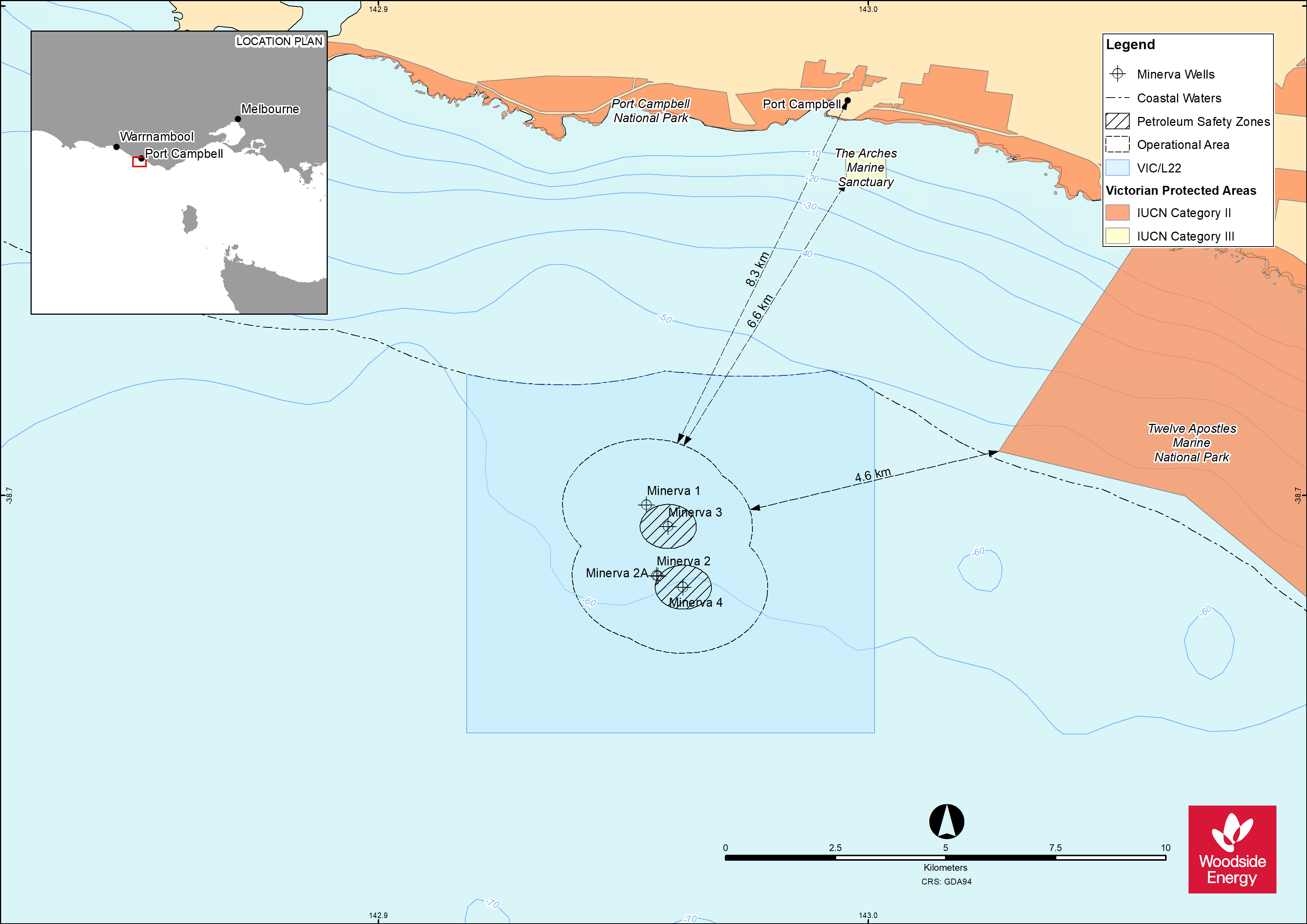 Woodside plans to undertake plug and abandonment activities for four subsea wells within the Minerva field in production licence VIC/L22. The plug and abandonment activities will occur within Commonwealth waters approximately 8 km south of the town of Port Campbell, Victoria. The plug and abandonment activities are part of the decommissioning of the Minerva gas field. Plug and abandonment permanently seals the wells to prevent release of hydrocarbons to the environment.