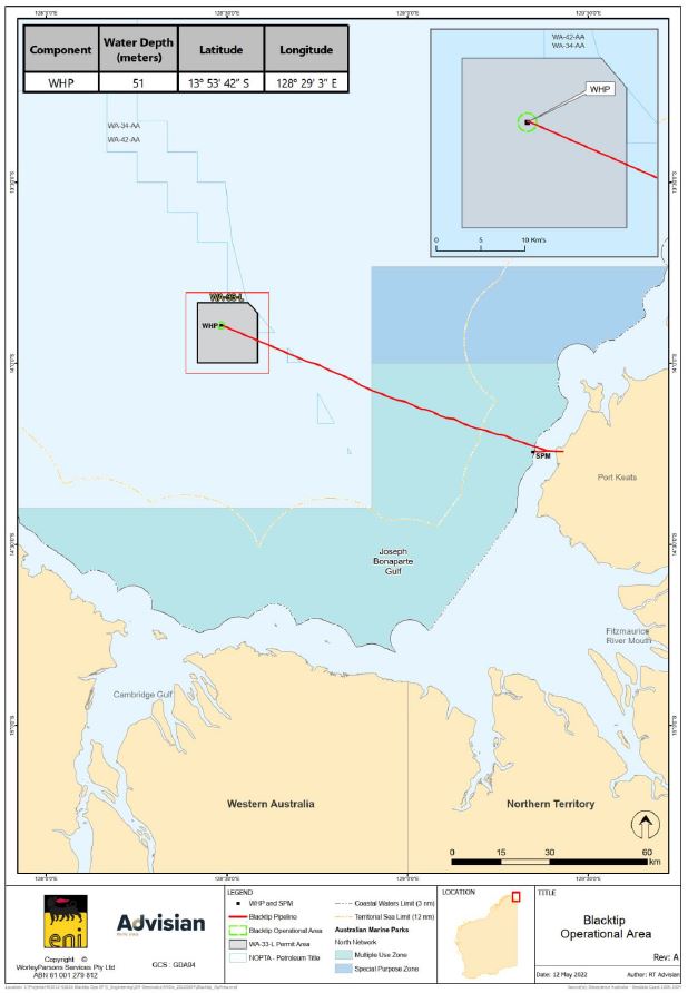 Eni Australia BV (Eni) operates the Blacktip facilities, approximately 300km west south west of Darwin, located in Lease Area WA-33-L, within Commonwealth waters in the Joseph Bonaparte Gulf (JBG). The facilities consists of a normally unpopulated wellhead platform (WHP) in approximately 51m water depth, platform wells, flowlines, and a subsea gas export pipeline (GEP) (Licence WA-15-PL, NT/PL2) bringing whole well stream fluid (as in, gas, condensate and produced water) to the Yelcherr Gas Plant (YGP) near Wadeye in the Northern Territory (NT). Stabilised condensate is stored on site at the YGP before being exported via a subsea condensate export pipeline (CEP) (NT/PL3) to a single point mooring (SPM), located approximately 7km offshore in Commonwealth waters, for loading to tanker vessels and subsequent transport to market.