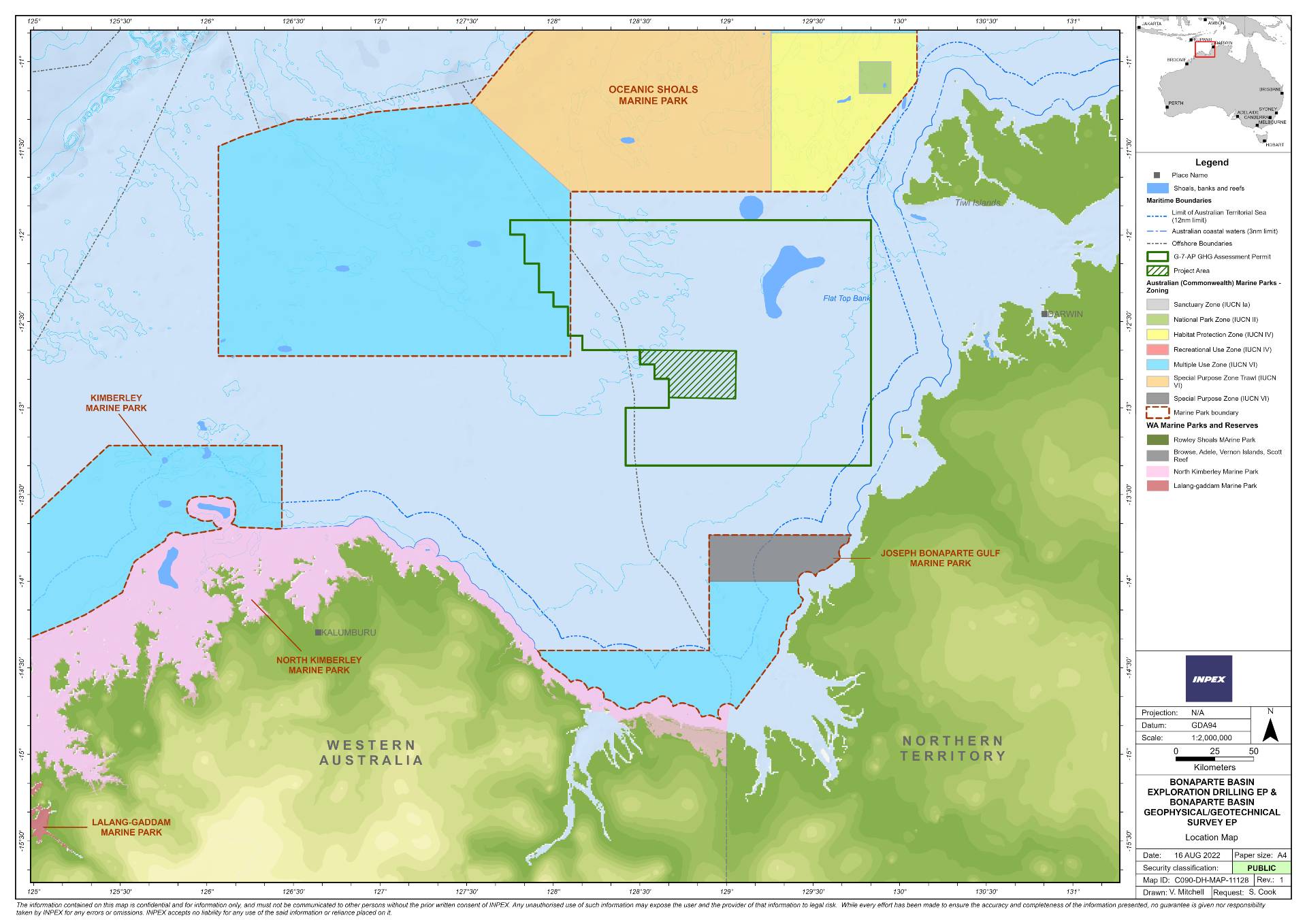 INPEX Browse E&P Pty Ltd on behalf of the Bonaparte Carbon Capture and Storage Assessment Joint Operating Agreement participants was successfully awarded GHG assessment permit G-7-AP, located offshore in the Bonaparte Basin off northern Australia. The G-7-AP permit area is wholly located within Commonwealth waters to the north of the Joseph Bonaparte Gulf and approximately 100 km west of Darwin Harbour. The proposed GHG activity covered by this EP will consist of a pre-drill geophysical and geotechnical site survey. The pre-drill site survey activities are provisionally expected to be conducted in the second half of 2023. However, for contingency purposes this EP allows for the activities to occur anytime in the calendar years 2023 and 2024.