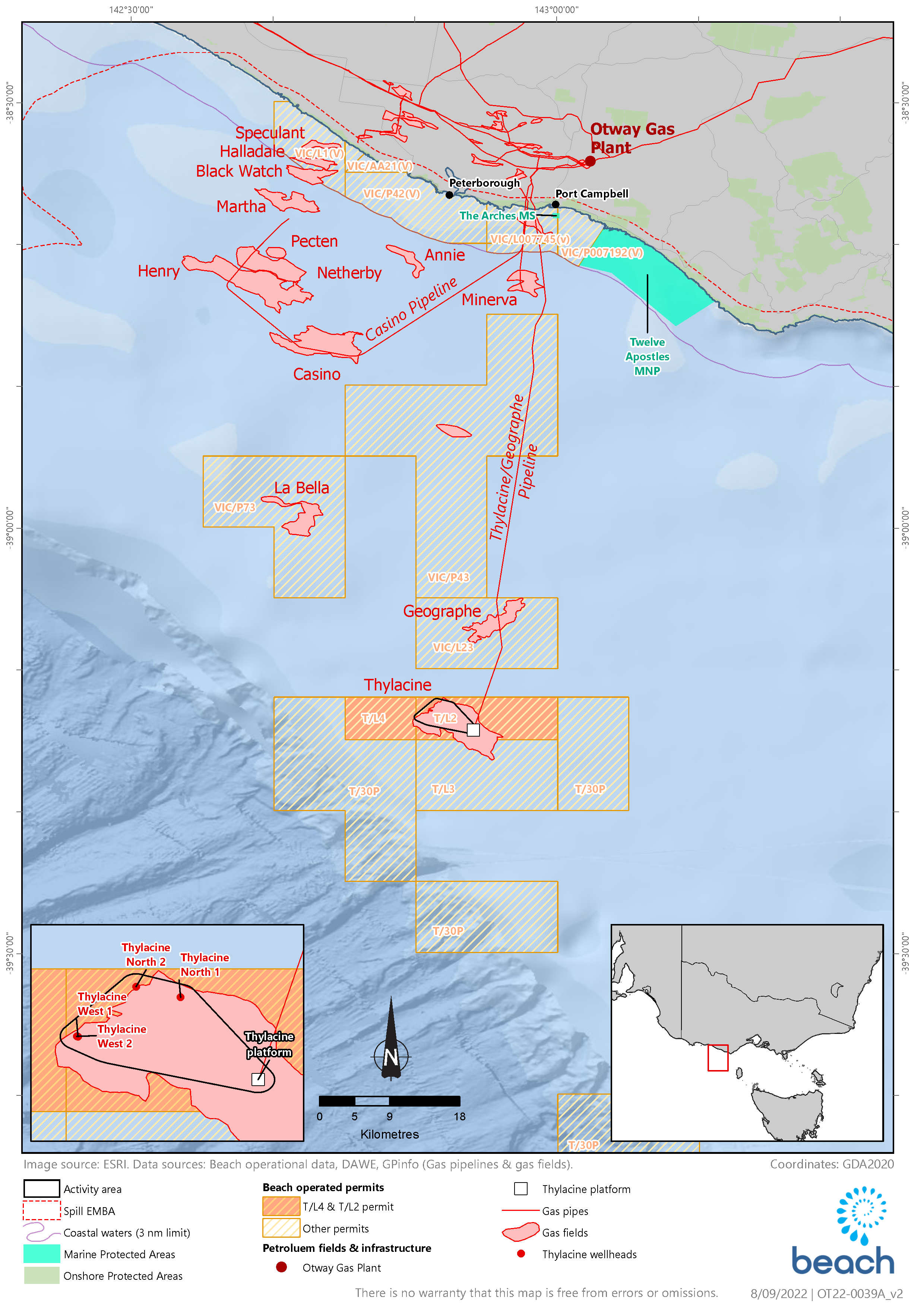 Beach Energy (Operations) Limited (‘Beach’) proposes to undertake subsea installation and commissioning activities at the recently drilled Thylacine North-1, Thylacine North-2, Thylacine West-1 and Thylacine West-2 production wells (the activity) associated with the Otway Offshore Phase 5 Development within petroleum production licence T/L2 and T/L4. The wells will be tied in to the existing Thylacine-A gas production platform.