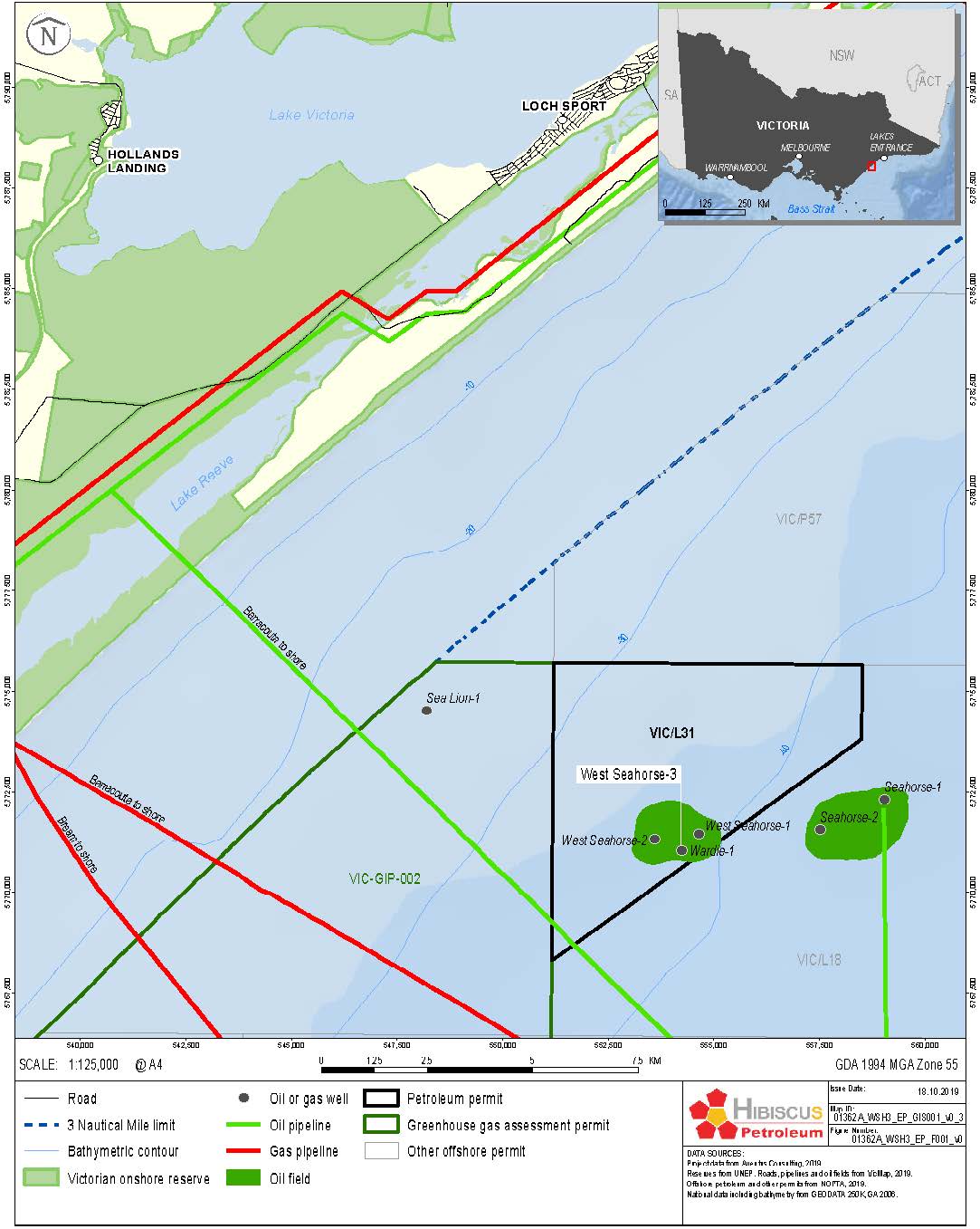 The activity is the non-production operations phase of the West Seahorse-3 temporarily abandoned (suspended) wellhead on the seabed in retention lease VIC/RL17 in the Eastern Bass Strait approximately 13 km off the Gippsland coast in a water depth of 39.5 m. The Wardie-1 well also lies within this permit, (approximately 2.8m distance from West Seahorse-3) and is abandoned with a short section of surface conductor remaining approximately 2m above the seabed.