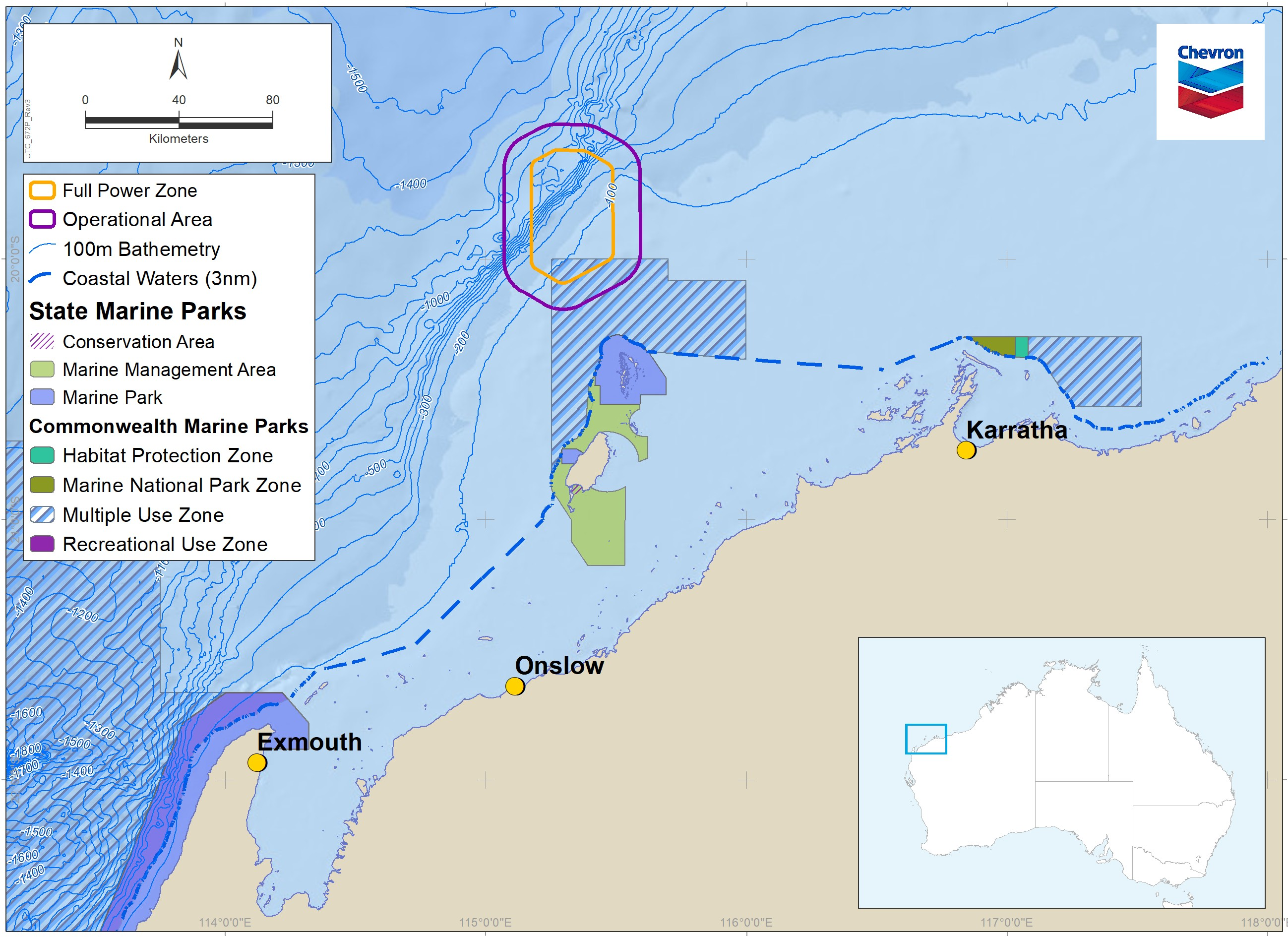 Chevron Australia proposes to conduct a 4-dimensional (4D) marine seismic survey (MSS) over production licences WA-46-L, WA-47-L and WA-48-L in the Wheatstone and Iago gas fields in Commonwealth waters north of Barrow Island, Western Australia. The 4D MSS aims to repeat the acquisition of the 3-dimensional (3D) MSS conducted over the same area in 2011–2012, as part of a monitoring program. The 4D MSS is scheduled to occur between mid-December 2023 and mid-April 2024, subject to vessel availability, and is expected to take ~75 days to acquire. While the seismic and support vessels may mobilise to the Operational Area during December 2023, seismic acquisition will not commence before 1 January 2024. Seismic acquisition will be conducted 24 hours a day.