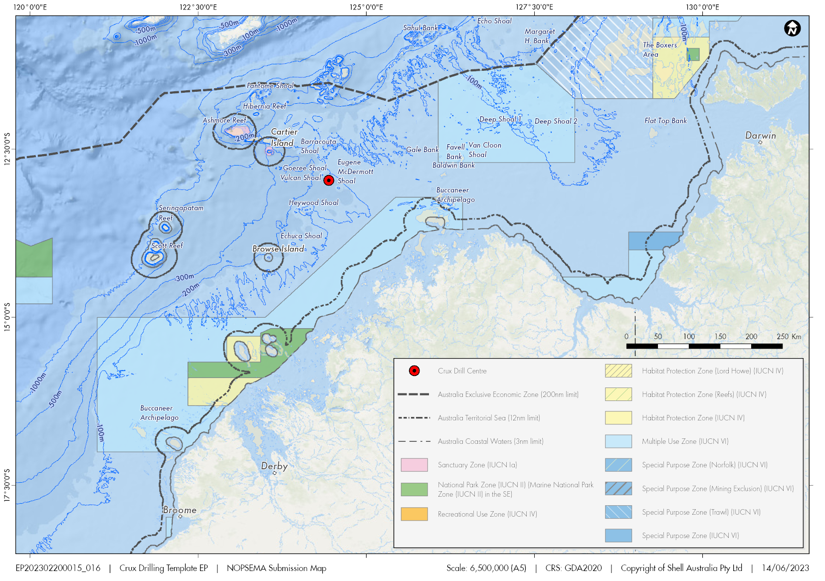 The Shell-operated Crux development is located in Commonwealth waters in the northern Browse Basin, 190 kilometers (km) offshore north-west Australia and 620 km north-east of Broome, in approximately 165 meters (m) water depth.
