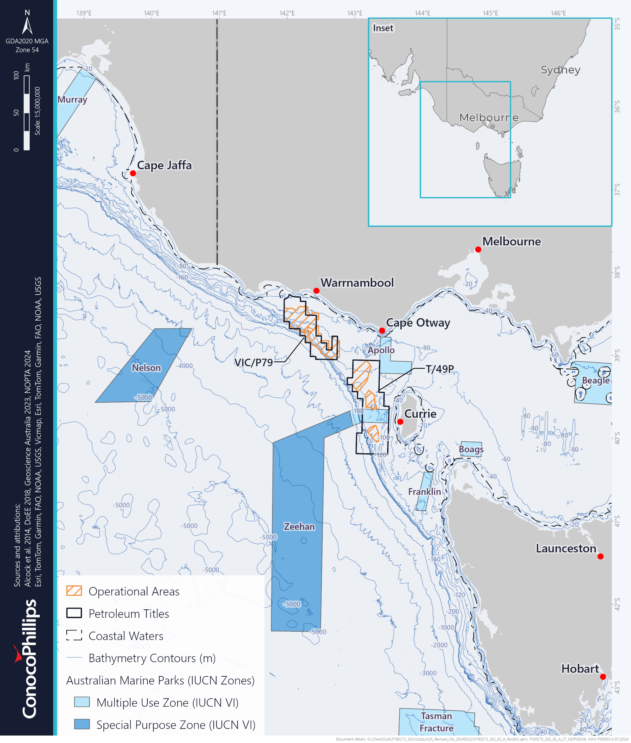 ConocoPhillips Australia SH1 Pty Ltd and ConocoPhillips Australia SH2 Pty Ltd (‘ConocoPhillips Australia’) are planning to undertake exploration activities in offshore permits VIC/P79 and T/49P located in Commonwealth waters of the Otway Basin, 20 km offshore of Victoria and 33 km offshore of King Island, Tasmania.