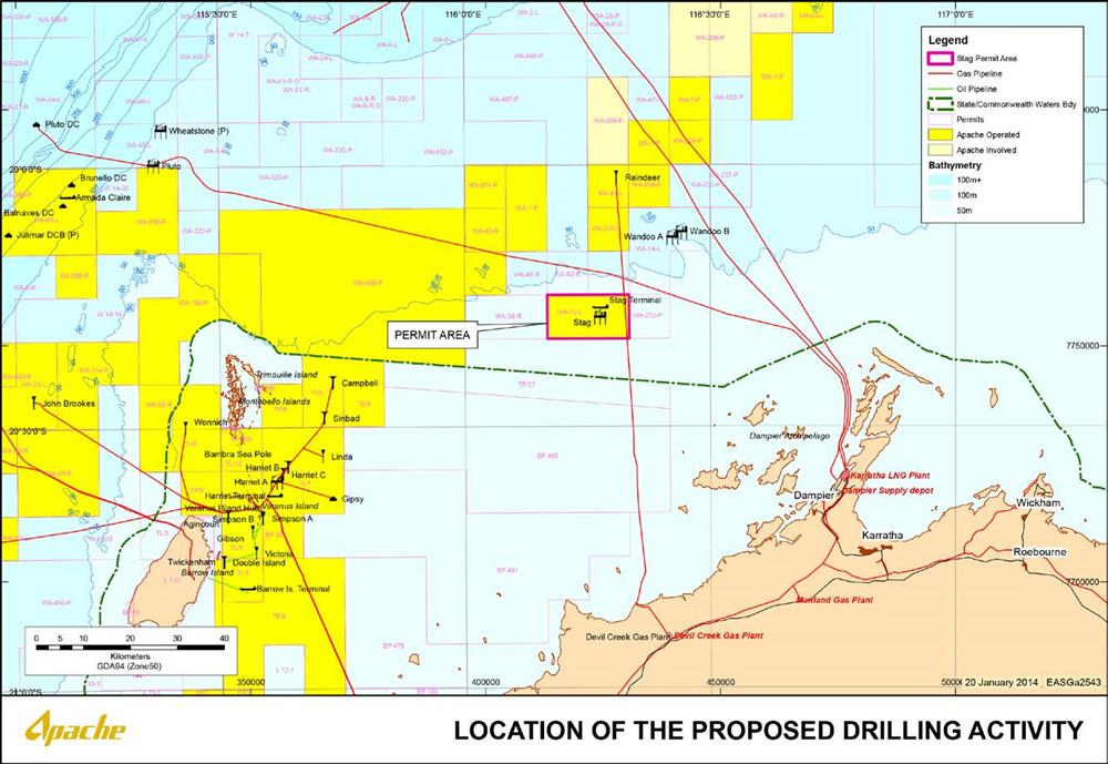 Apache Northwest Pty Ltd (Apache) is the operator of the Stag Field Production and Export Facility (Stag Facility). The facility is located 53 km northwest of Dampier in approximately 49 m water depth in the Commonwealth waters of the North West Shelf (NWS). Oil is currently produced from the Stag Reservoir via production wells, and seawater is injected via injection wells. Ongoing drilling and completions activities will be necessary to maintain oil production, and eventually decommission the facility. The Operational Area (Permit WA-15-L) is located in Commonwealth waters in the Carnarvon Basin, north Western Australia. The boundary of the permit WA-15-L has been used as the ‘Operational Area’ within which petroleum activities covered under this environment plan will occur.