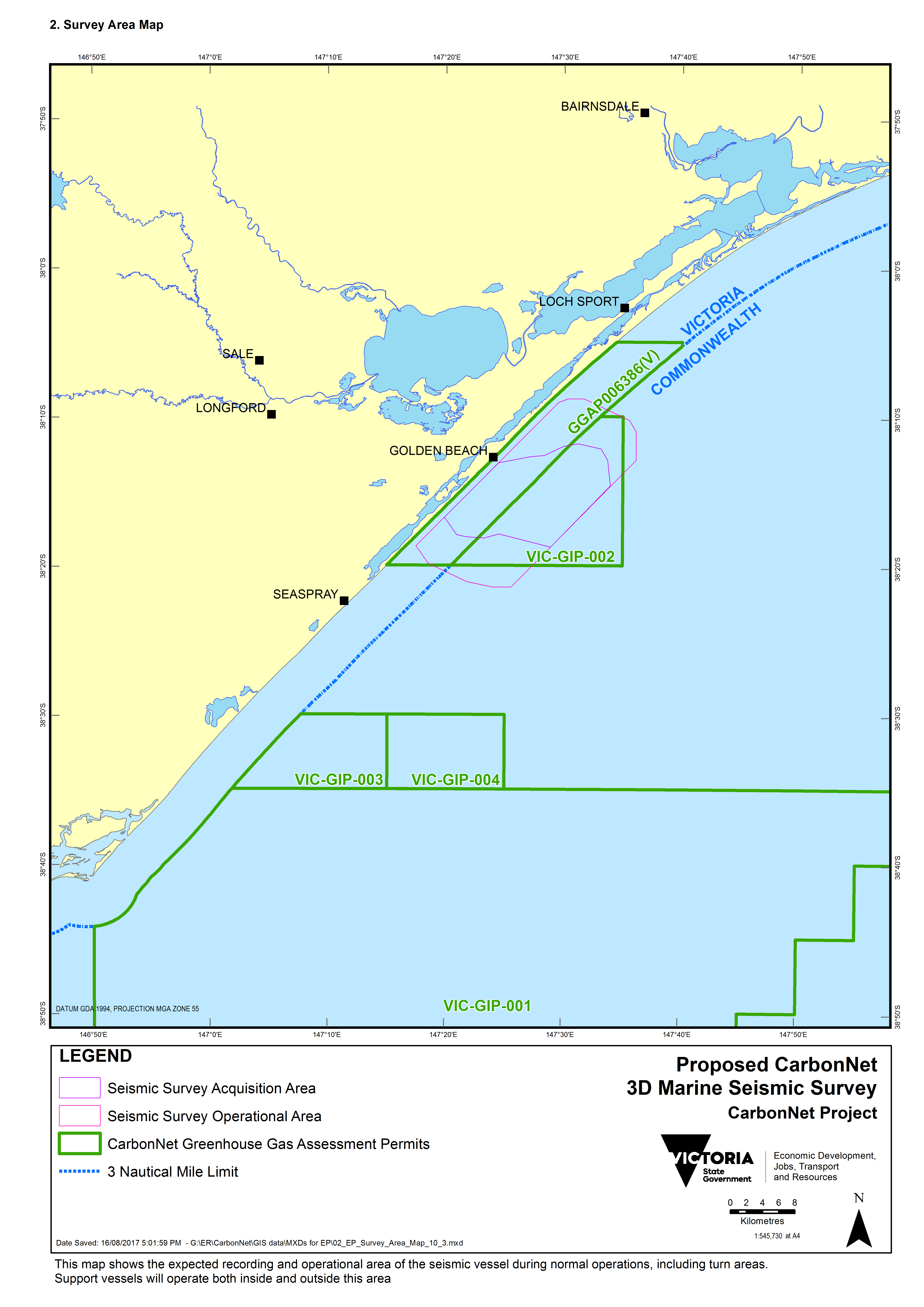 The Crown in right of Victoria is proposing to conduct the Pelican three-dimensional marine seismic survey (‘Pelican 3DMSS’) in the Gippsland Basin off eastern Victoria in Greenhouse Gas Assessment Permits VIC-GIP-002 (Commonwealth waters) and GGAP006386(V) (Victorian state waters). These permits are managed by the CarbonNet project (CarbonNet) within the Victorian Department of Economic Development, Jobs, Transport and Resources (DEDJTR).