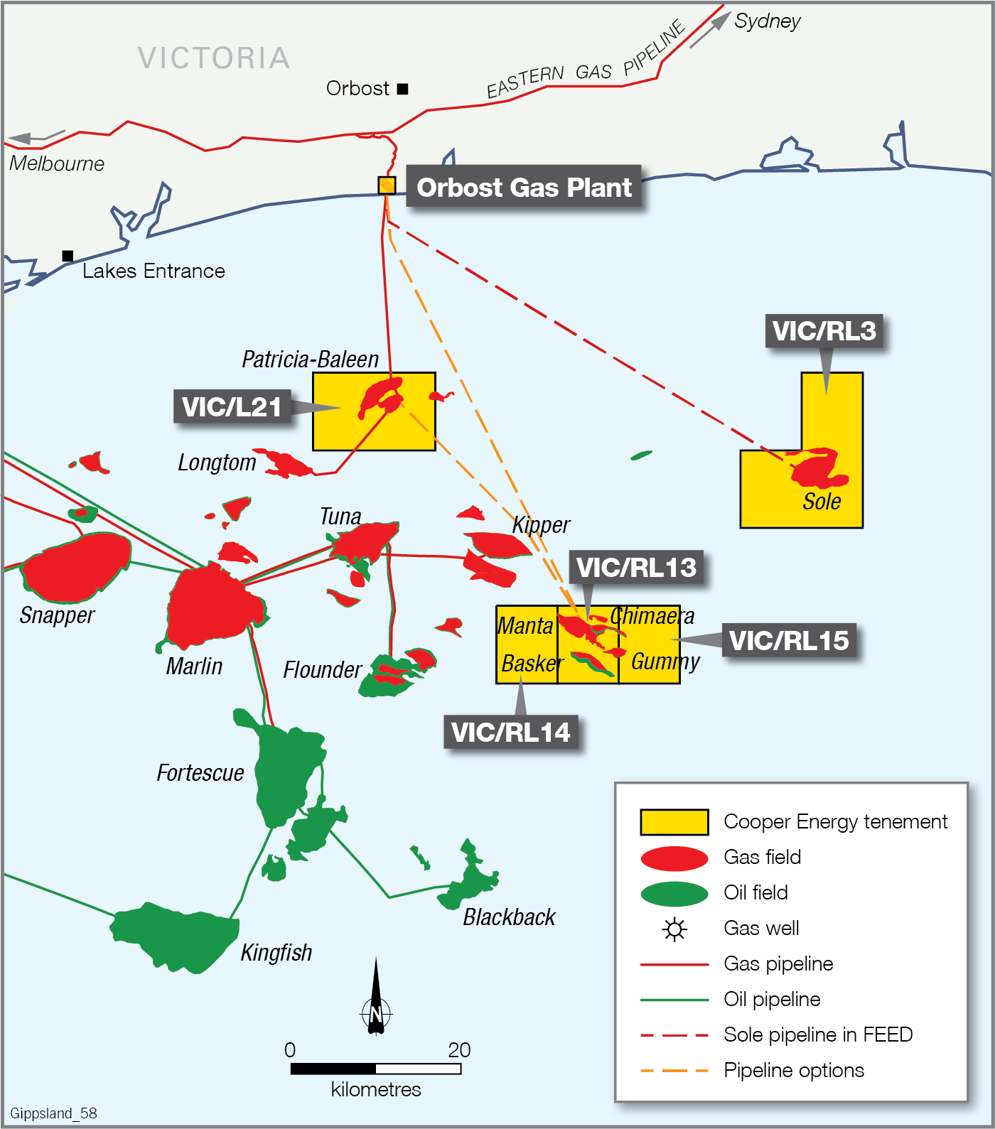 The Basker-Manta-Gummy (BMG) field is located in water depths of approximately 135 m to 265 m in Petroleum Retention Lease VIC/RL13, approximately 55 km south of Cape Conran in East Gippsland, Victoria in the eastern waters of Bass Strait.