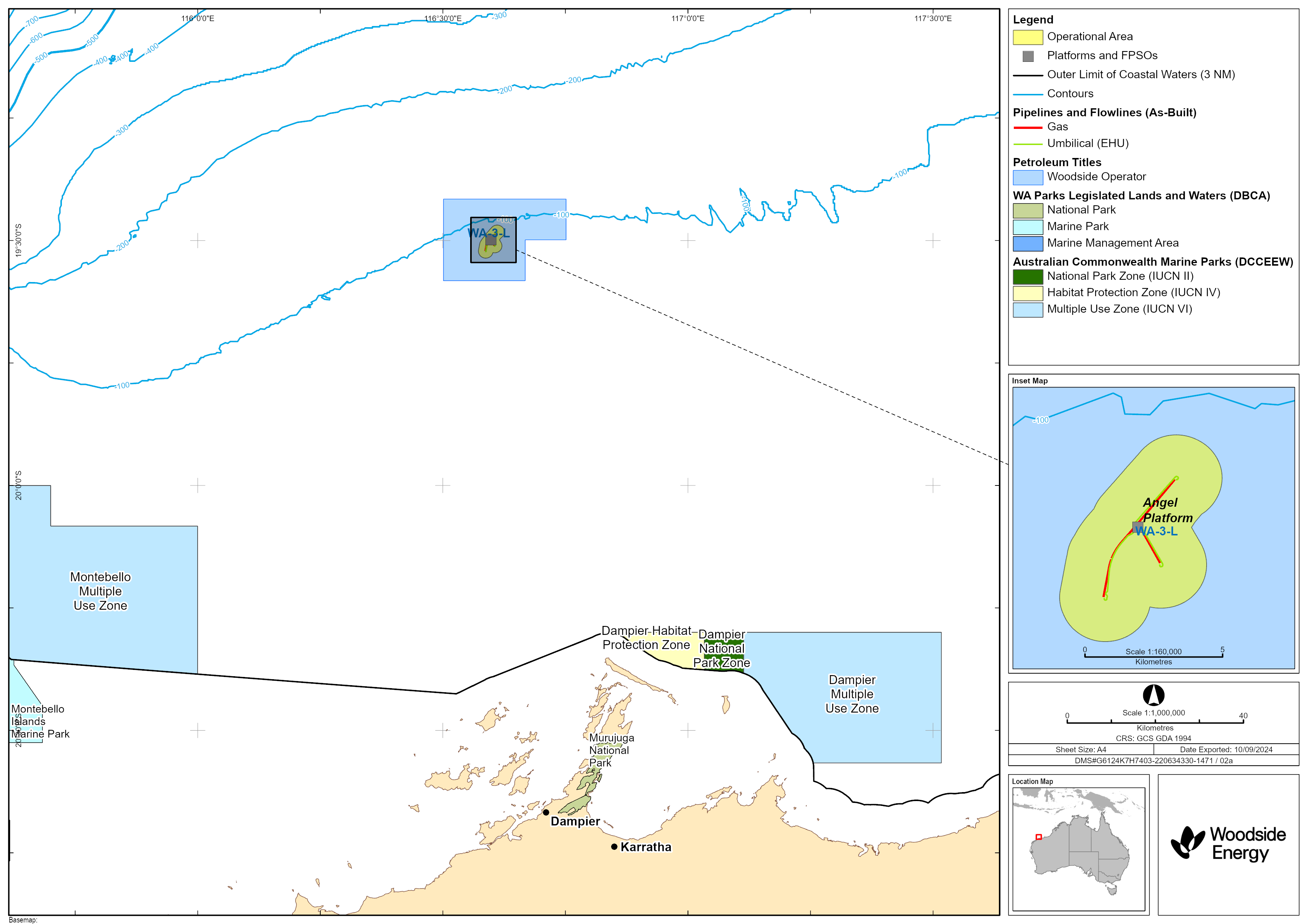 Woodside is planning to undertake subsea and well infrastructure removal decommissioning activities within the Angel Field, as part of the Petroleum Activity under this Environment Plan (EP). The Angel subsea and well infrastructure is located around the Angel production platform in Commonwealth waters, approximately 125 km north of Dampier. The Angel subsea infrastructure is in water depths between approximately 77 m and 85 m in Petroleum Title WA-3-L. Woodside plans to remove redundant Angel subsea infrastructure and three production wells connected to the Angel platform.