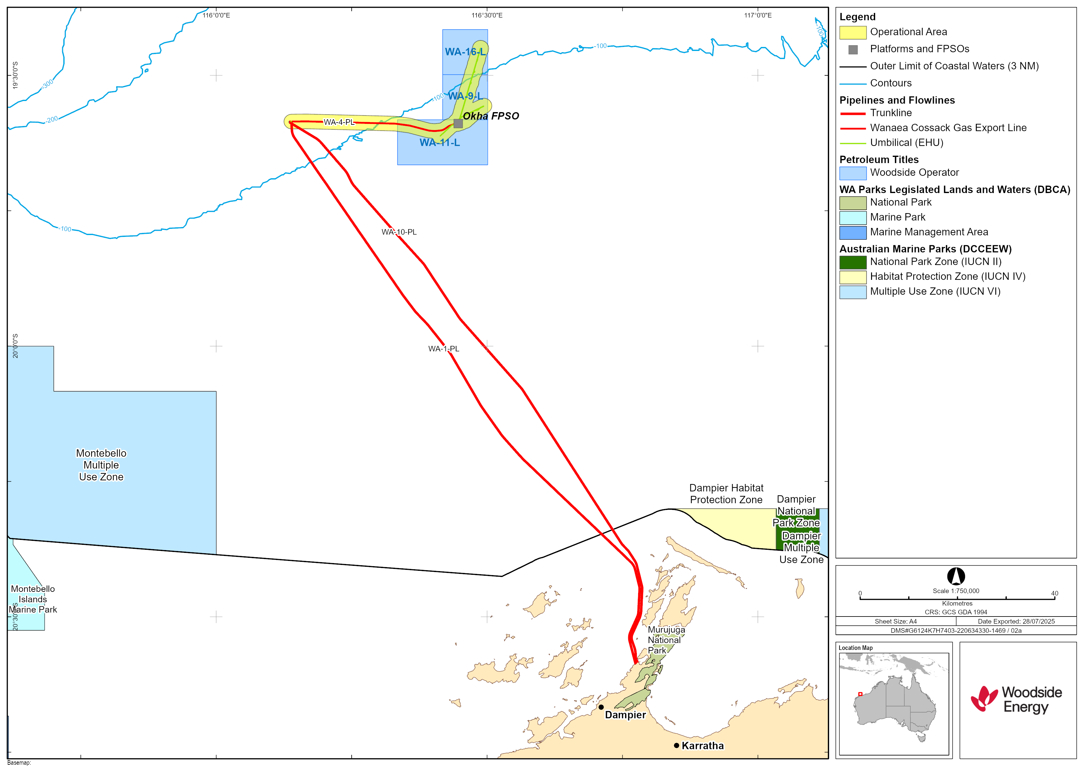 The Okha floating production, storage and offloading (FPSO) facility is located in Commonwealth waters approximately 104 km from the closest coastline and approximately 119 km northwest of the town of Dampier, Western Australia. The facility commenced production in 2011 and produces oil and gas from the Cossack Wanaea Lambert Hermes (CWLH) fields. The Okha FPSO is located in production license WA-11-L in approximately 80 m of water over the central area of the Wanaea field. Wells and subsea infrastructure associated with the Okha FPSO are located in production licences WA-9-L, WA-11-L, and WA-16-L in water depths up to 129 m. The Wanaea Cossack gas export line (WC GEL) exports natural gas from the CWLH fields and operates under pipeline licence WA-4-PL. Water depths along the WC GEL vary from approximately 80 m the eastern end (at Okha), to approximately 125 m the western end (approximately 32 km west of the FPSO).
