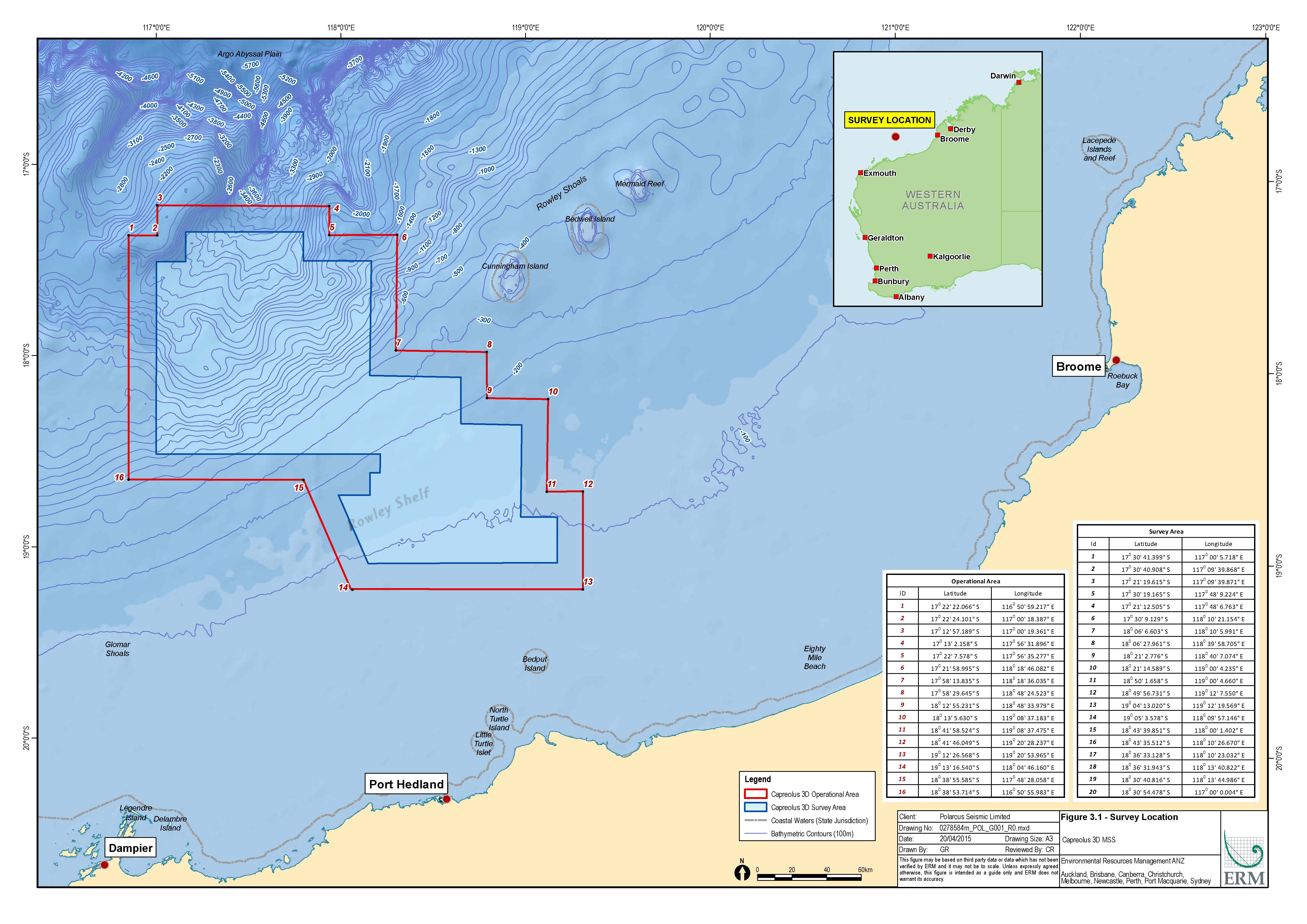 The Capreolus 3D MSS operational area comprises approximately 38,000 km2• The operational area incorporates the necessary space for vessel manoeuvring and ancillary activities (i.e. additional area for the purpose of line run-outs, source testing soft starts and turns etc.). At its closest the operational area is approximately 120 km north of Port Hedland and approximately 320 km west of Broome.