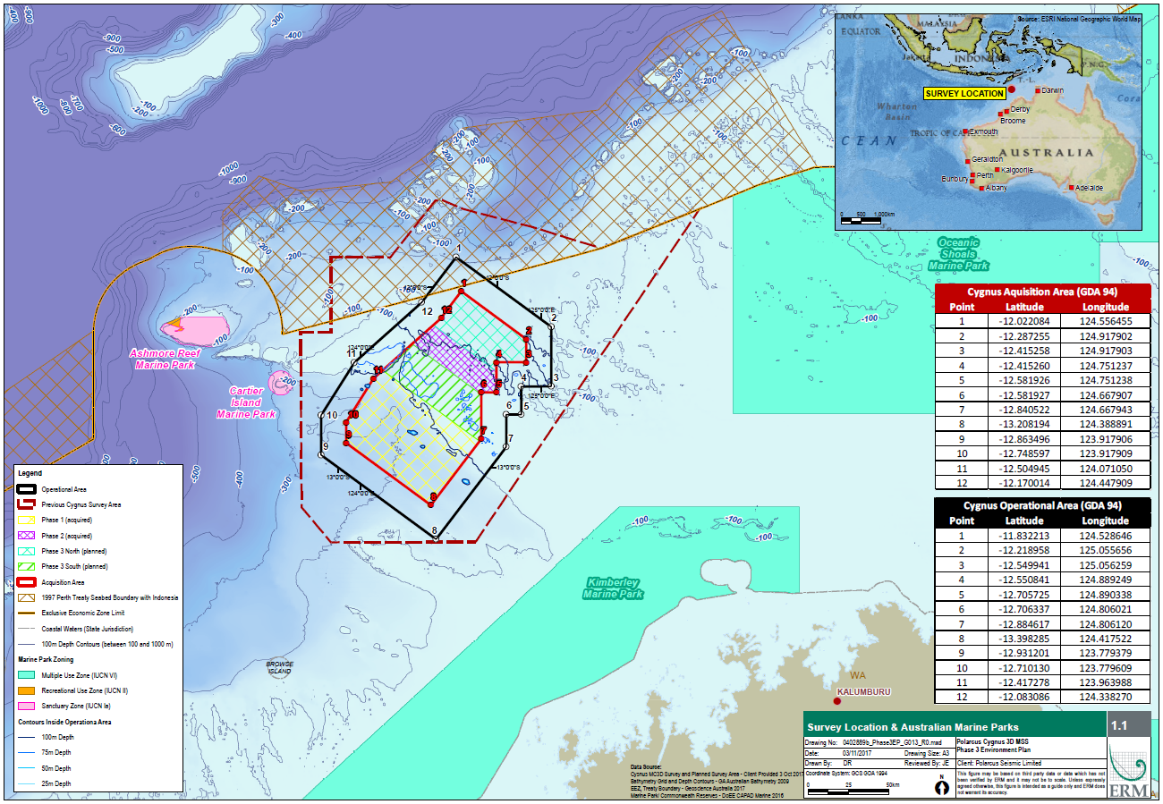 The Cygnus 3D Marine Seismic Survey (MSS) is a three-dimensional marine seismic survey in Commonwealth waters of the Vulcan Sub-basin. Phase 1 and Phase 2 of the Cygnus 3D MSS were previously completed between December 2015 and March 2016 in accordance with environmental management measures detailed in a previously accepted Environment Plan (NOPSEMA reference 3446), which is valid until the 31st December 2017. This revision of Environment Plan is submitted to NOPSEMA to allow for an extension to the timeframe of the Cygnus 3D MSS EP to the 31st December 2018. The original Cygnus 3D MSS EP Survey Area has also been refined to include a smaller Operational Area and Acquisition Area for Phase 3 of the Cygnus 3D MSS. The Acquisition Area comprises the area within which 3D seismic acquisition will be undertaken and covers approximately 7,240 km². The Acquisition Area is surrounded by a larger Operational Area, which comprises additional area for the purpose of line turns, run-ins, run-outs, soft starts, source testing, etc. The Operational Area is located approximately 170 km off the Kimberley coast of northern Western Australia (WA) and 180 km from the Indonesian archipelago and East Timor. The survey will be undertaken in Commonwealth waters in water depths of up to approximately 245 m.Phase 3 of the Cygnus 3D MSS is expected to comprise the following:• Phase 3 North;• Phase 3 South; and• Potential additional orthogonal infill lines within the Phase 1 area.The next phases of the Cygnus 3D MSS are anticipated to take a total of approximately 2 – 3 months to acquire, completed between 2017 and 31st December 2018.