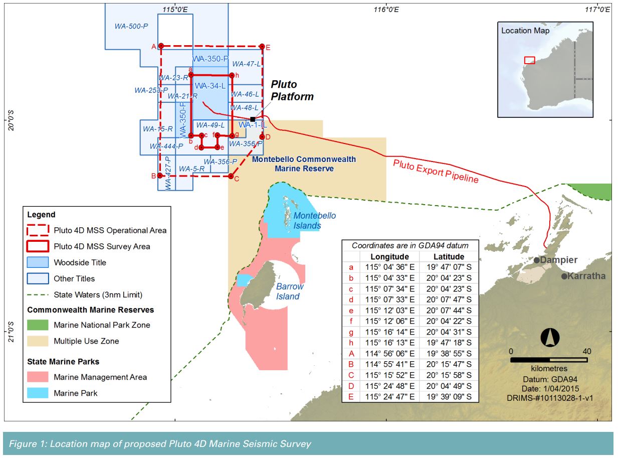 The proposed Pluto 4D MSS Operational Area covers the additional petroleum permits of WA-1-IL, WA-5-R, WA-427-P, WA-444-P, WA-15-R, WA-356-P and WA-253-P.