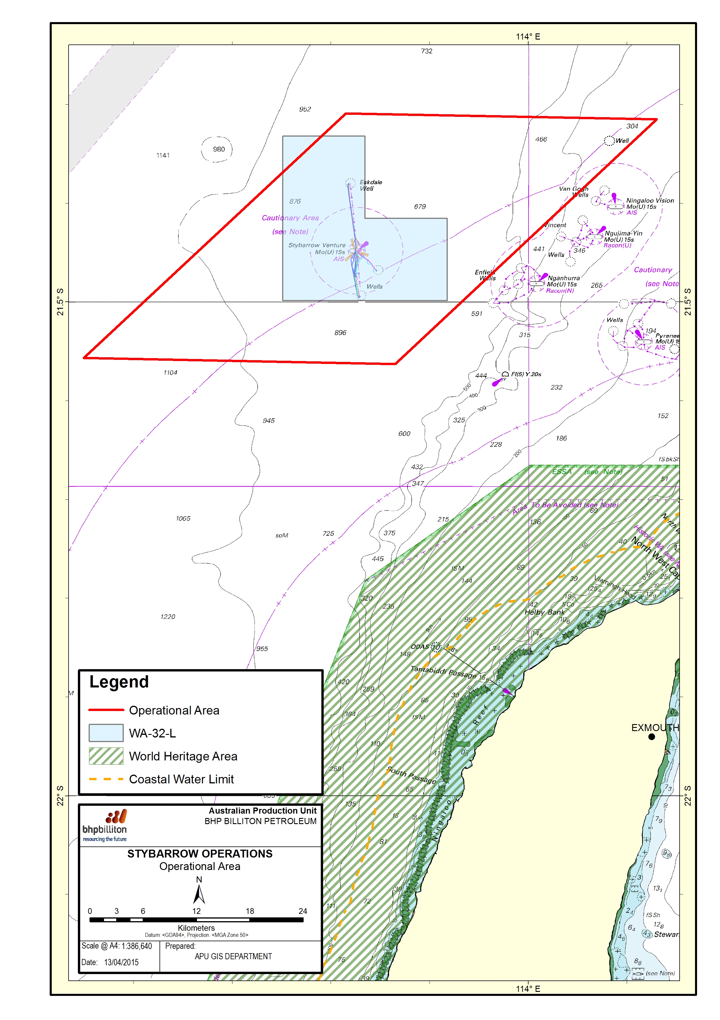 The Stybarrow Facility produced crude oil from the Stybarrow and Eskdale reservoirs via a single stand-alone Floating Production Storage and Offloading Facility (FPSO). The Stybarrow Facility was located in Commonwealth waters approximately 51 km northwest of the North West Cape of Western Australia and approximately 30 km north-west of the northern boundary of Ningaloo Marine Park (Commonwealth Waters) and approximately 55km west-north-west of Exmouth (refer Figure 11).