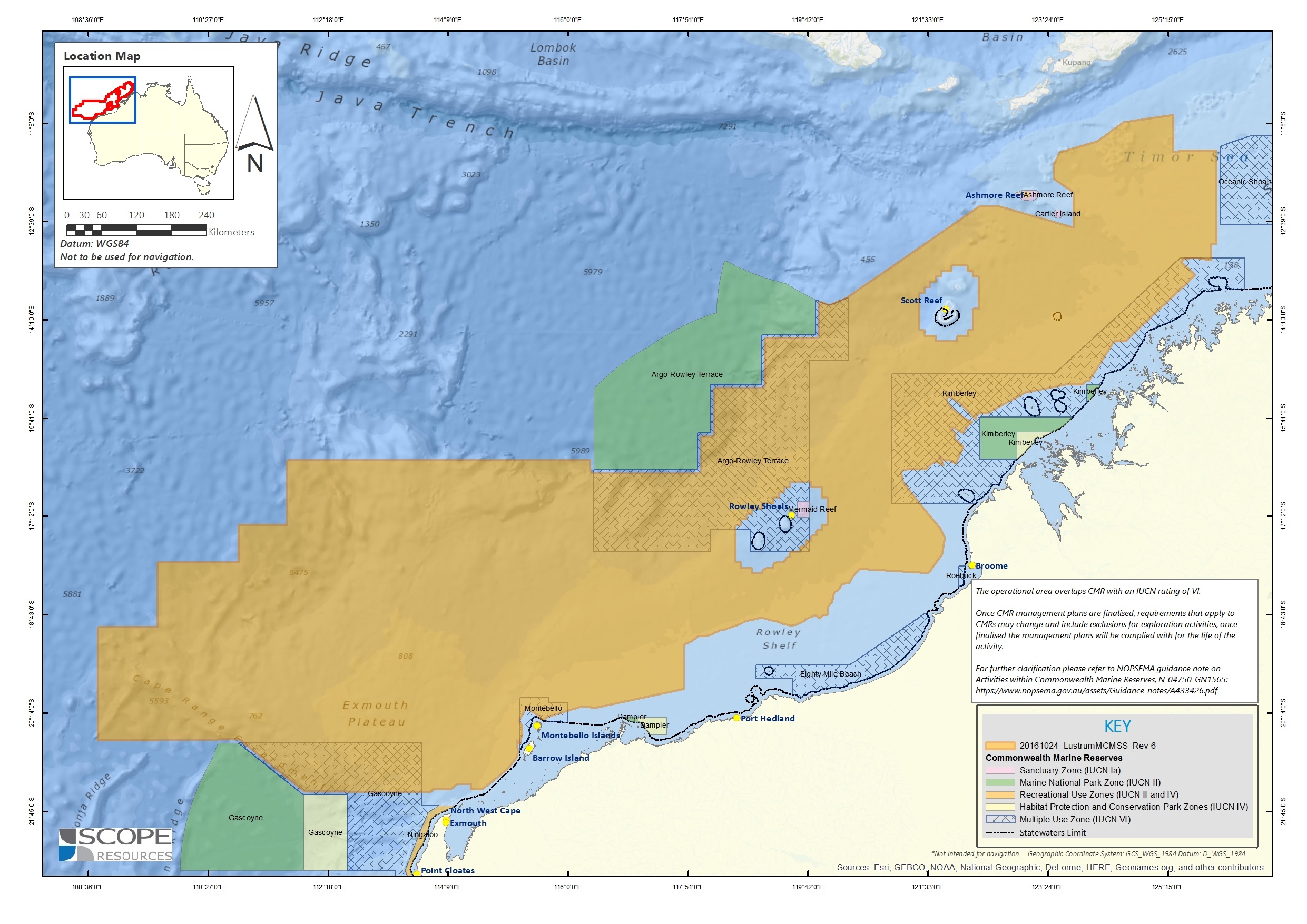 CGG proposes to acquire multi-client three-dimensional (MC3D) and multi-client two-dimensional (MC2D) marine seismic surveys (MSS) within the Lustrum Multi-client (MC) Marine Seismic Survey (MSS) polygon, in the North-west Marine Region offshore from Western Australia. The Lustrum MC MSS polygon is based on a basin-wide approach and is comprised of greater than 800,000 square kilometres (km2). Water depths within the Lustrum MC MSS polygon range from ~30 m to ~5,000 m, with the deepest water depths situated in the offshore regions of the polygon. The Lustrum MC MSS polygon extends from Point Cloates northwards to the offshore waters west of Troughton Island in the Kimberley.