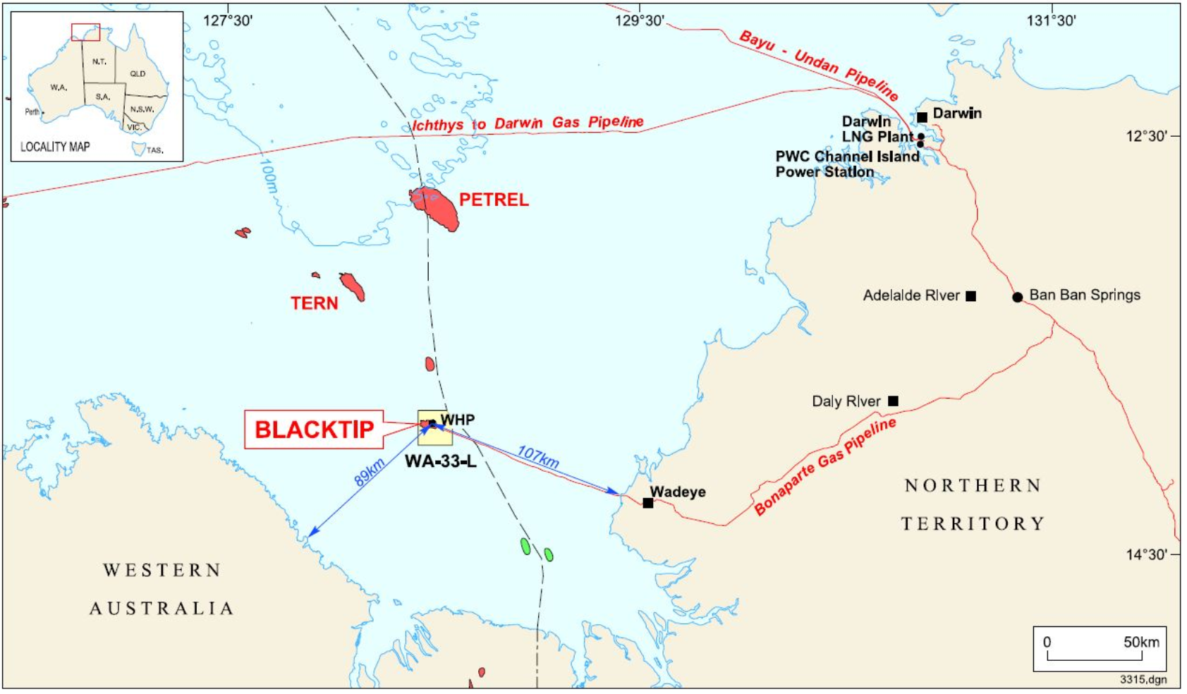 Eni Australia Limited operates the Blacktip facilities, approximately 300 km west-south-west of Darwin, located in Lease Area WA-33-L, within Commonwealth waters in the Joseph Bonaparte Gulf. The field commenced production in 2009. Blacktip field has an estimated production life of 25 years and an installation design life of 30 years.