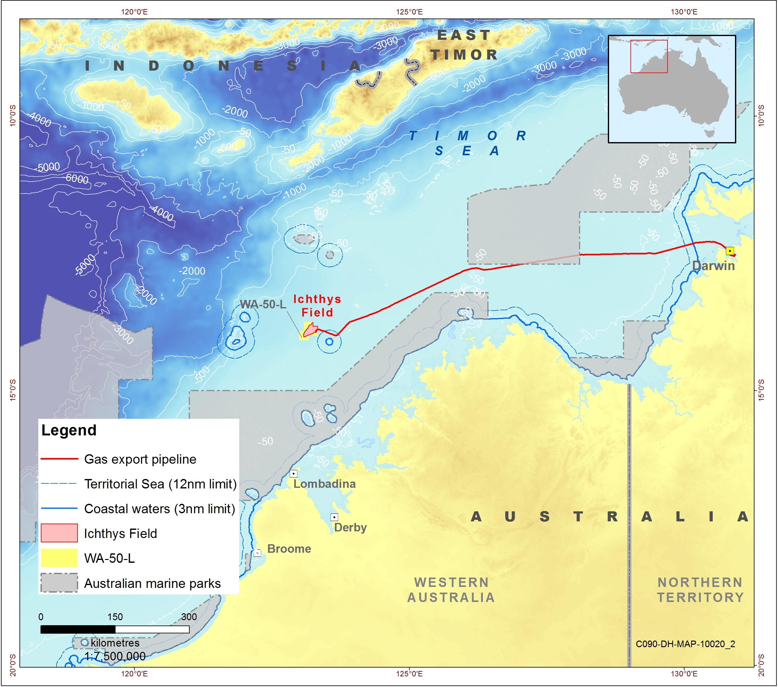 The Ichthys gas field is a natural gas field located in the Timor Sea, off the north western coast of Australia. The field is located 220 km offshore Western Australia and 820 km southwest of Darwin, with an average water depth of approximately 250 metres. Production of LNG occurs at an onshore liquefaction plant located at Bladin Point, near Darwin connected to the offshore Ichthys field by an 889 km subsea pipeline.