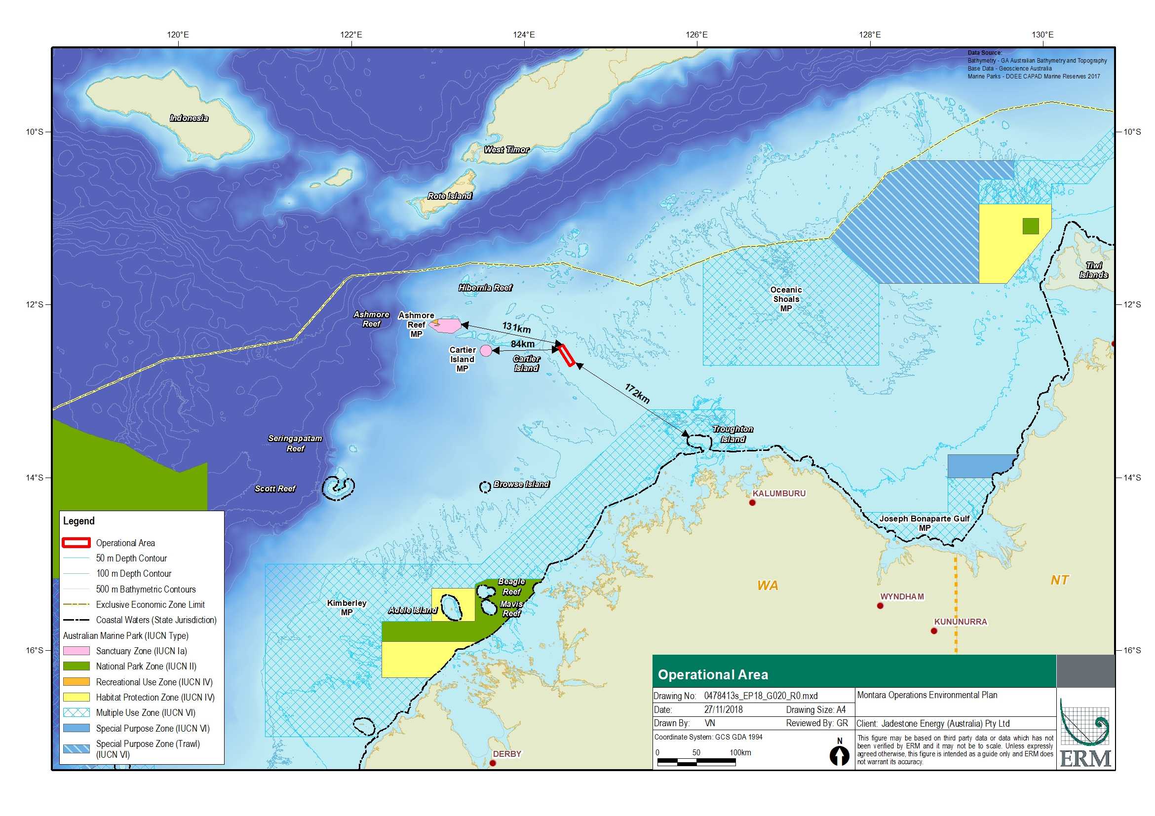 Jadestone Energy Inc. and Jadestone Energy Eagle entered into an agreement with PTTEP Australasia (Ashmore Cartier) Pty Ltd (PTTEP AA), under which Jadestone Energy Eagle acquired the Montara Operations from PTTEP AA in 2018. The Montara Venture Floating Production Storage Offtake (FPSO), unmanned wellhead platform and subsea infrastructure, are located in the Timor Sea, in the Ashmore Cartier territory within Commonwealth waters, approximately 690 km north-west of Darwin within 34 km of Vulcan Shoal. The facilities lie in water depths of approximately 80 m. The Montara development currently produces crude oil from the Montara, Skua, Swift and Swallow fields which is transported via flowline for processing at the well head platform and FPSO. The well head platform currently has five production wells, and there are five subsea production wells located approximately 17 to 18 km from the FPSO.