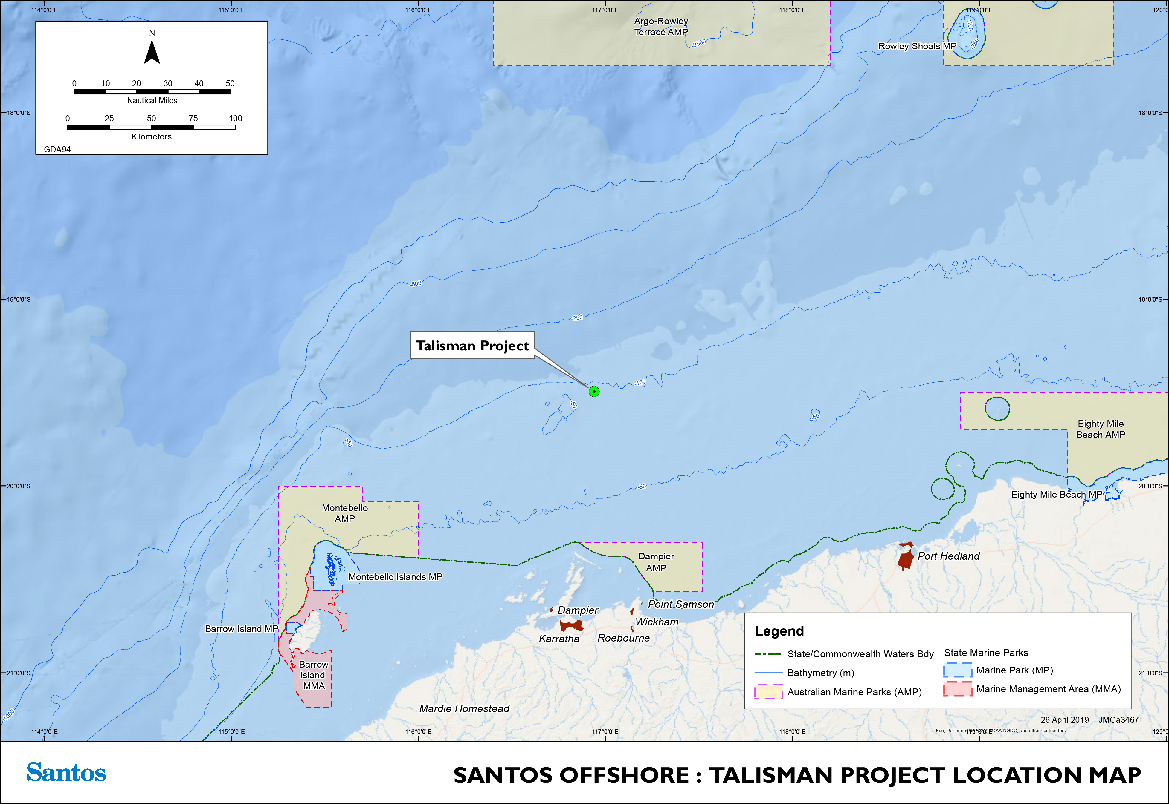 Production from the Talisman project, operated by Marathon Petroleum Australia and located approximately 120km north of Dampier, ended in 1992. During decommissioning all locatable items were recovered from the Talisman field, with the exception of some production equipment (comprising a flowline, umbilical line, anchor, some chain and a tyre weight) which has remained on the seabed since that time.