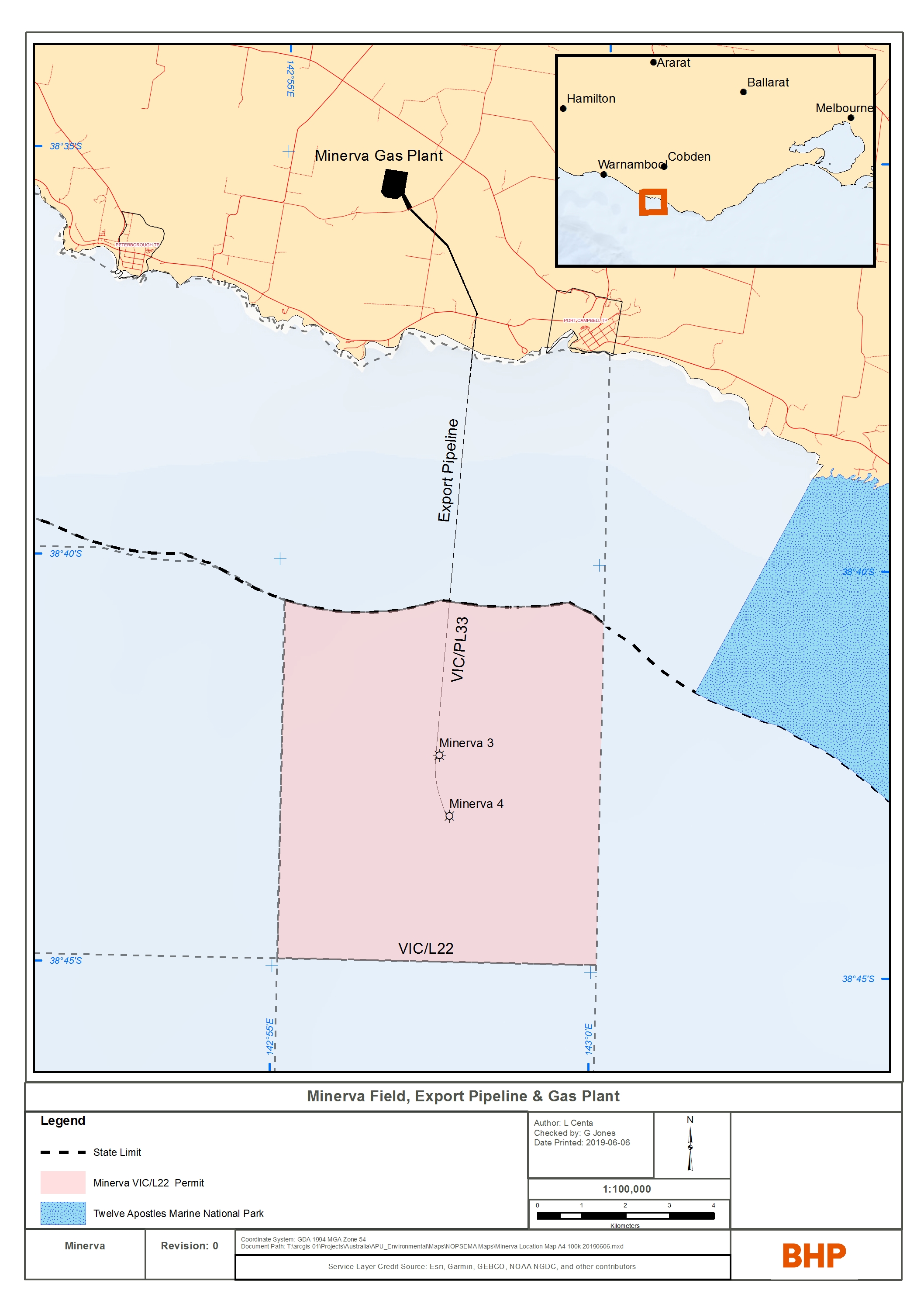 The Minerva field is situated within production licence VIC-L22 and pipeline in Commonwealth waters VIC-PL33 located in the Otway Basin in 60 m of water approximately 11 km southwest of Port Campbell, Victoria.