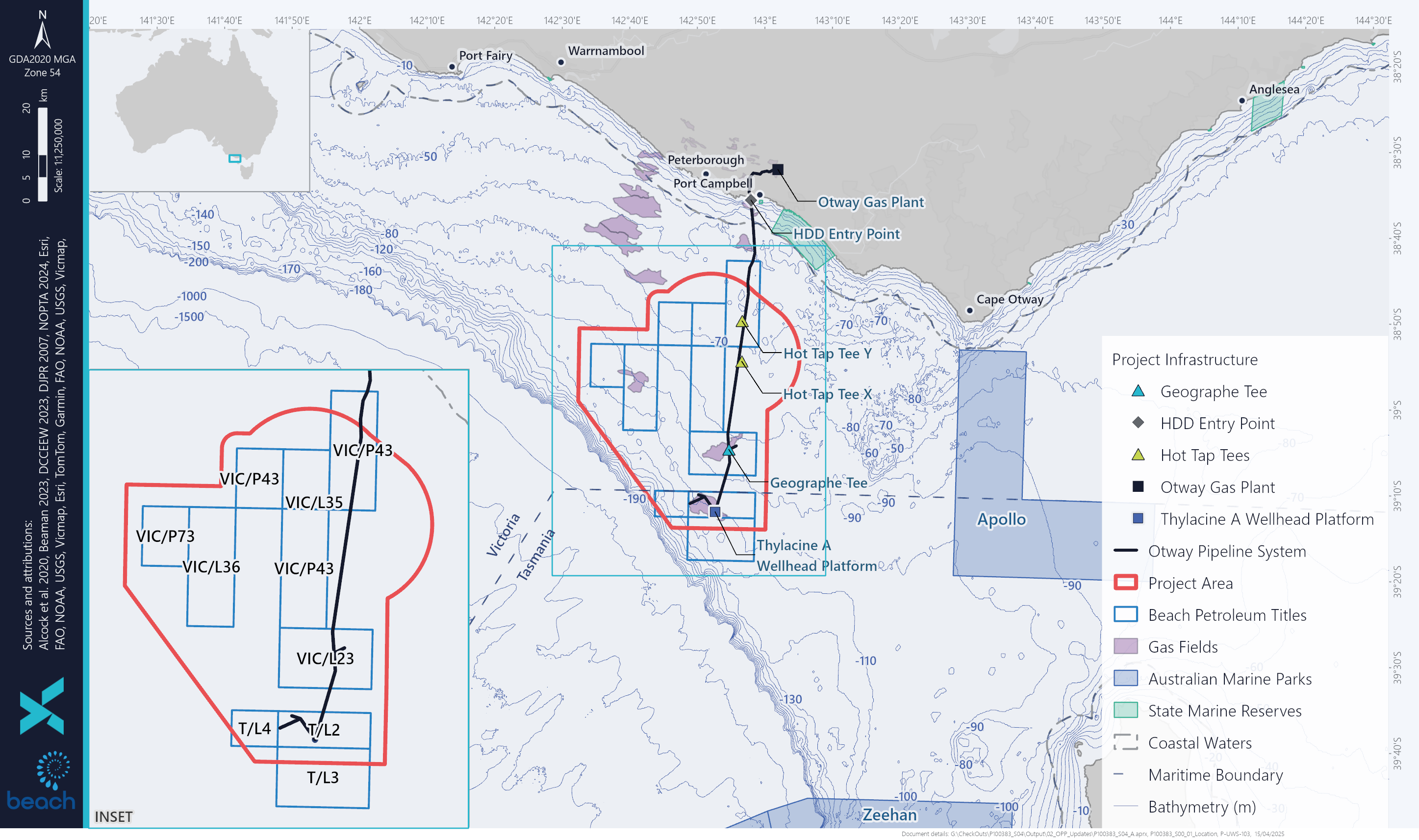 The Project is adjacent to Beach’s current production operations at the Geographe and Thylacine gas fields in the offshore Otway Basin. The Project Area is located north of the existing Thylacine platform and includes the locations of gas discoveries and exploration prospects within approximately 10 km of these discoveries and pipeline tie in points with corridors for subsea connections. Installation of subsea infrastructure including wellheads, flowlines, umbilicals, manifolds and skids will be undertaken to connect any gas discoveries to existing infrastructure.