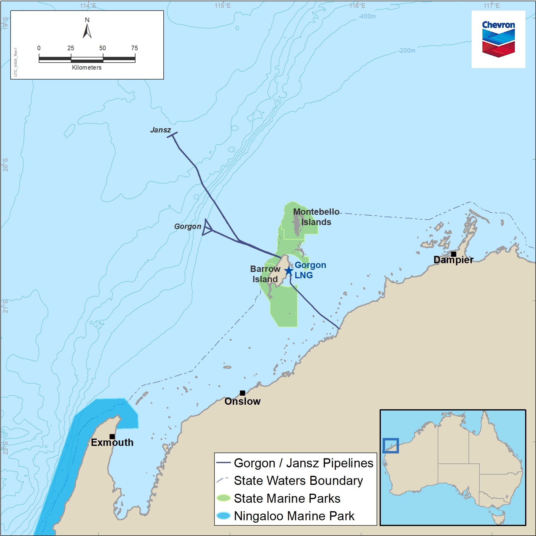 The Jansz–Io gas fields are located approximately 200 km off the Pilbara coast of Western Australia in water depths of approximately 1,350 m. The Gorgon gas field is located approximately 130 km off the Pilbara coast of Western Australia, and 65 km north‐west of Barrow Island, in water depths of approximately 200 m.